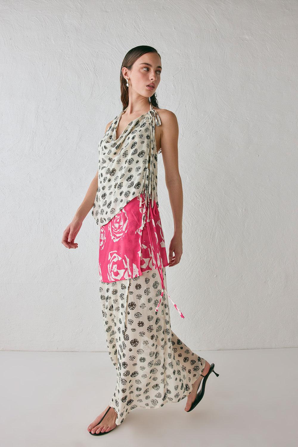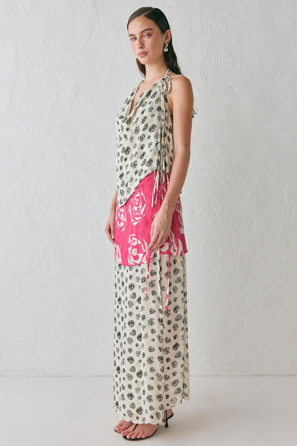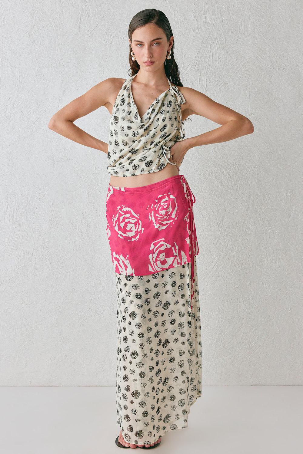 The Jovana Wrap Maxi Skirt Rosa features an exclusive in-house print. Featuring an attached contrasted layered mini wrap skirt. Designed in Australia.