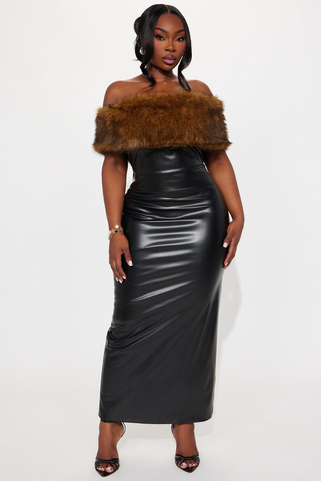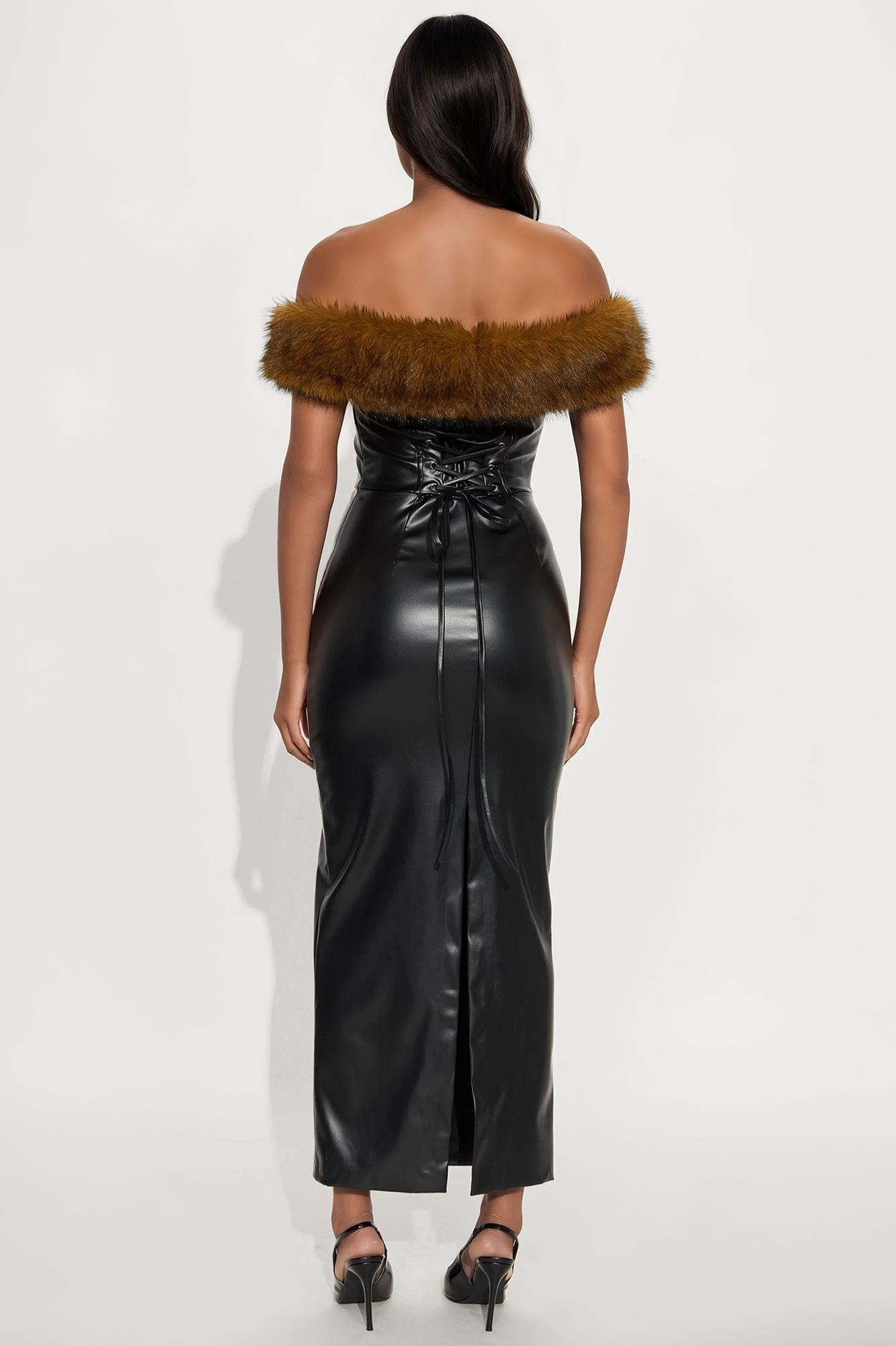 Available In Black And Burgundy. Faux Leather Maxi Dress Off the Shoulder Fur Trim Straight Neckline Lace Up Back Back Slit Hidden Side Zipper Lined Non Stretch Shell 1: Coating: 100% Polyurethane Ground, Shell 2 & Lining: 100% Polyester Imported