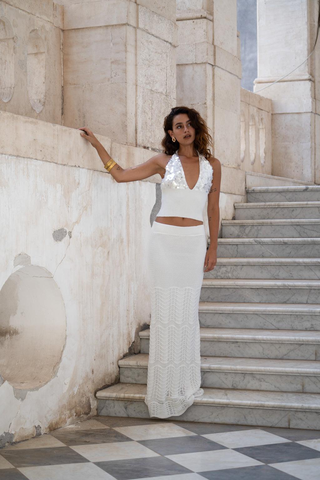 Introducing the newest cool girl summer staple - the Jovie Ivory Knit Maxi Skirt textured knit with a maxi silhouette and comfortable knit material is the perfect piece that can take you from warm summer nights into crisp fall evening and look soooo cute doing it. Add a little sparkle and complete the look with the Trinity Knit Payette Halter Top.