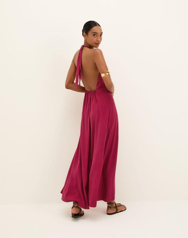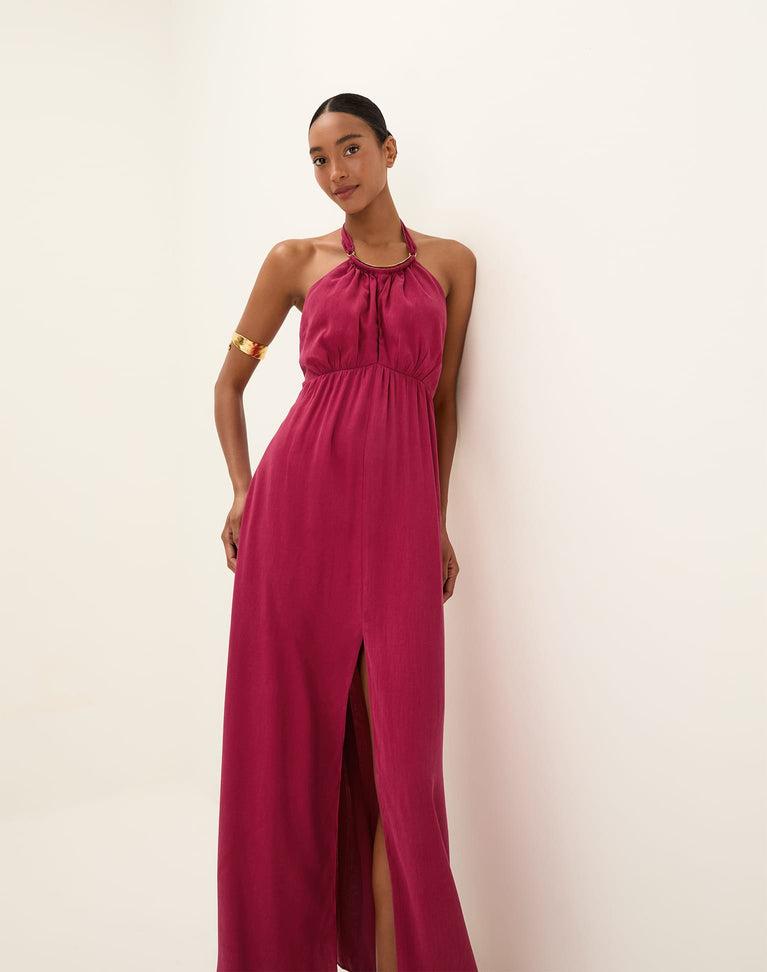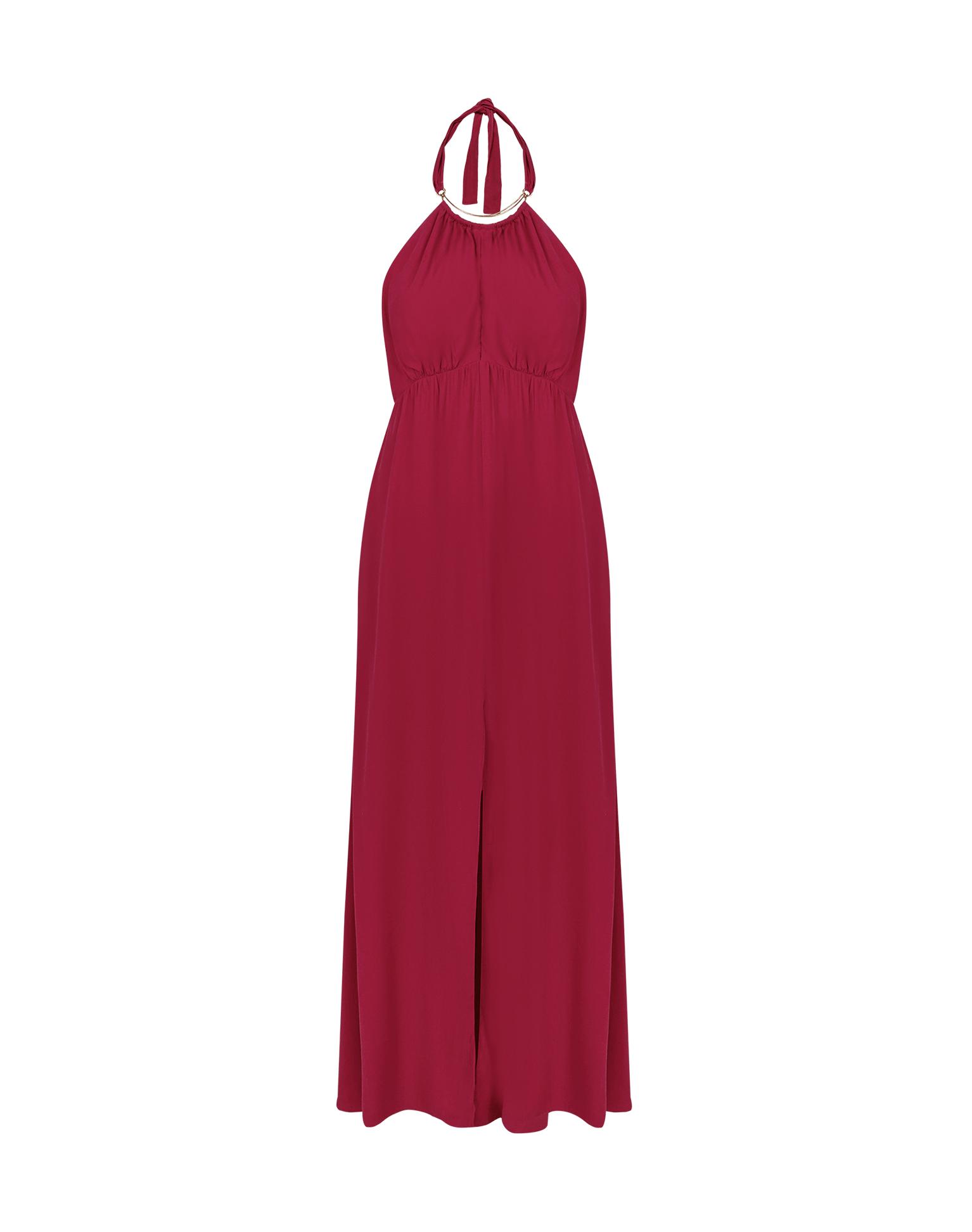 The ViX Joy Long Dress is a sleeveless maxi silhouette featuring a neckline highlighted by a gold-plated frame detail that elegantly doubles as a collar. A front slit adds movement and allure, while the open back and adjustable tie closures at the neck complete the look with a touch of sophistication. Style the Joy Lon