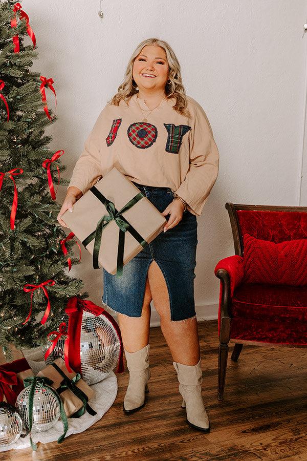 - Plaid 'JOY' lettering sews onto the front featuring ivory, navy, hunter green, yellow, and red hues
