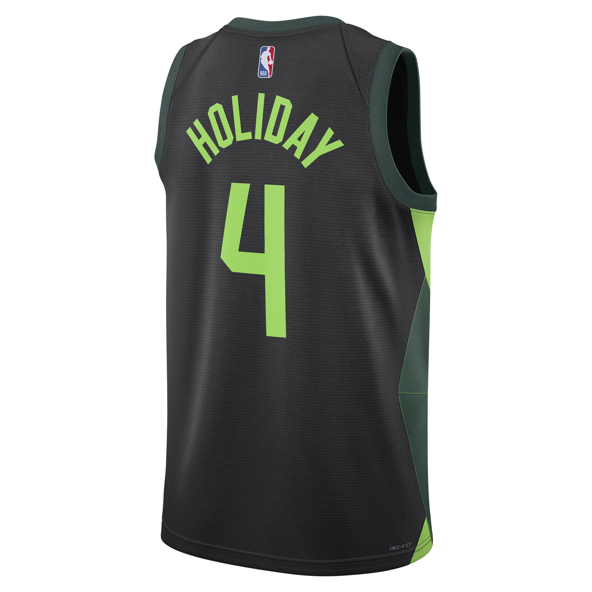 It all leads back to Boston. From the iconic players of the early days to the modern masters of the game, the Celtics’ story spans eras, championships and generations of fans. Retaining some of last year's details, the 2024/25 City Edition Jersey continues their celebration of the game's origin, but honors the evolution of the franchise and the future of the sport. City Edition:Our NBA City Edition collection celebrates the bond between a team and the town they call home. We took inspiration from iconic symbols and past uniforms to highlight the unique cultures, communities and history that give your favorite franchise local pride. Stay Dry:Nike Dri-FIT technology moves sweat away from your skin for quicker evaporation, helping you stay dry and comfortable. Modeled After the Pros:Replica design gives you details modeled after what the team wears. Product Details:Futuristic green accent color. Weave pattern on side panels. 100% polyester. Machine wash. Imported. Style: FQ4335; Color: Black/Pro Green/Action Green; Size: M; Gender: Male; Age Group: Adult | Jrue Holiday Boston Celtics 2024/25 City Edition Men's Nike Dri-FIT NBA Swingman Jersey in Black, Size: Medium | FQ4335-014