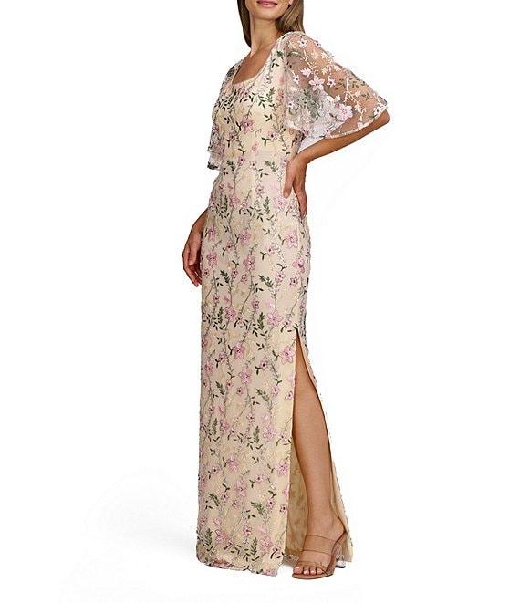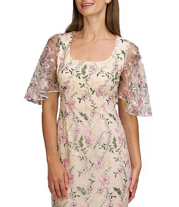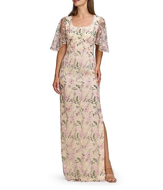 JS Collections Hannah Scoop Neck Short Illusion Flutter Sleeve Floral Sequin Embroidered Column Gown