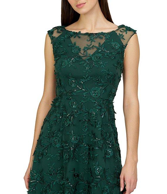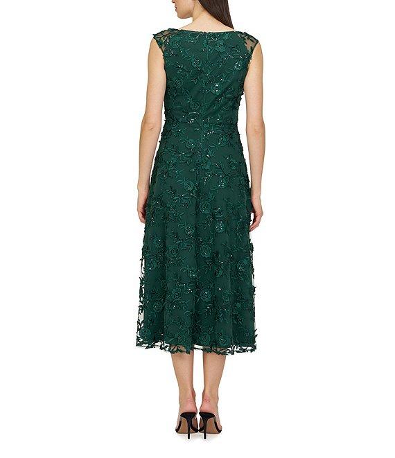 JS Collections Viviana Embroidered Beaded Mesh Sleeveless Crew Neck A-Line Midi Dress