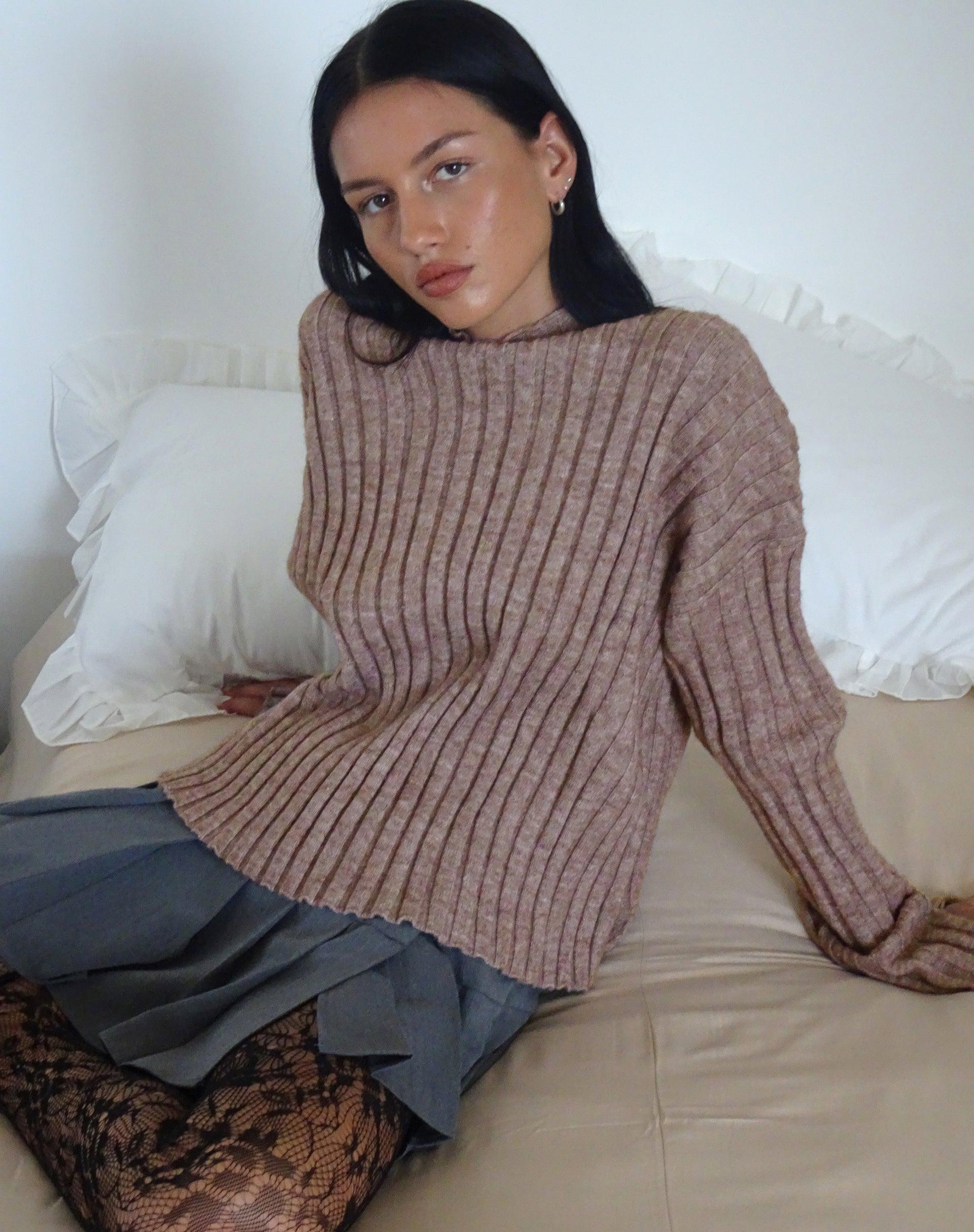 Level up your knits with the Judah jumper. Featuring a loose, oversized fit with long sleeves and a high neckline in a taupe chunky rib knit fabric. We love to wear with our Casini skirt. MODEL WEARS SIZE: EXTRA SMALL - MODEL HEIGHT:5'7 - FABRIC CONTENT: 42% ACRYLIC 28% NYLON 30% POLYESTER