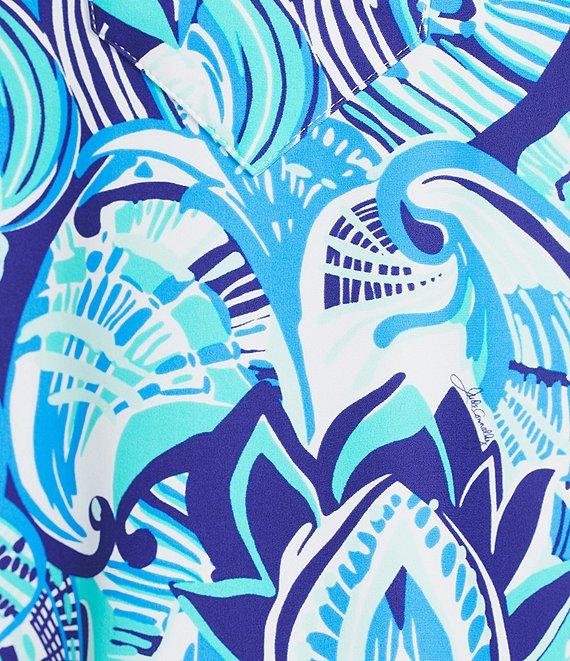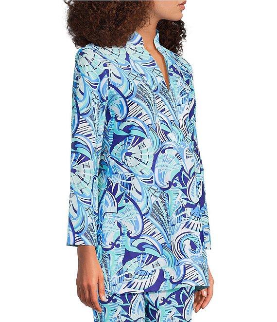 From Jude Connally, this top features: Jude cloth stretch knit wrinkle-free fabrication V-neckline with mandarin collar Bracelet length sleeves Fanfair seaglass print Straight hemline with side slits Pullover construction Approx. 29.25" length Nylon/spandex Machine wash/line dry Made in the USA.
