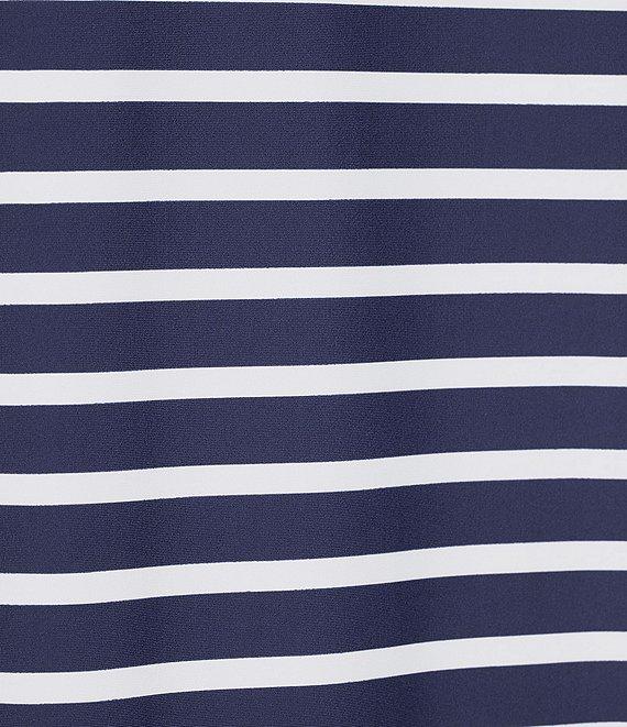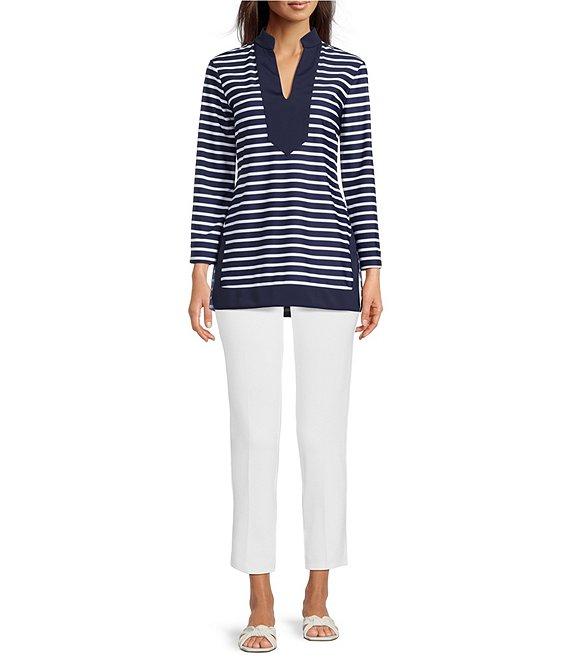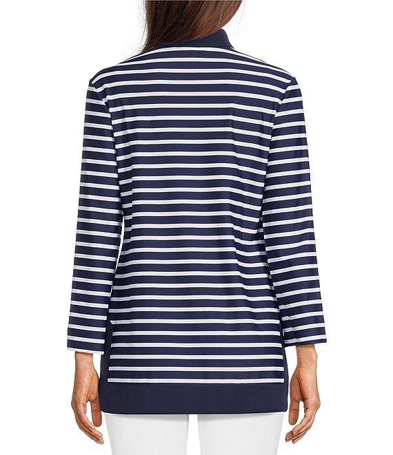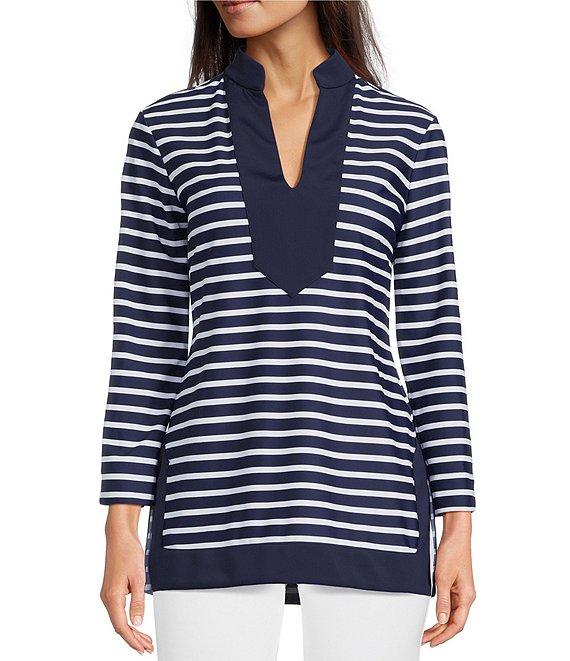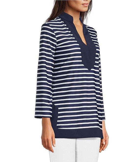 From Jude Connally, this top features:Jude cloth stretch knit wrinkle-free fabricationV-neckline with mandarin collar Bracelet sleevesEveryday stripe printStraight hemline with side slitsPullover constructionApprox. 29.25" lengthNylon/spandexMachine wash/line dryMade in the USA.