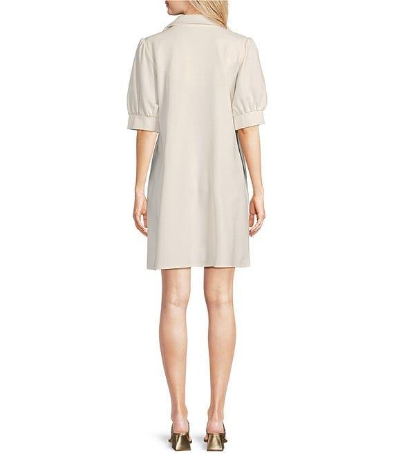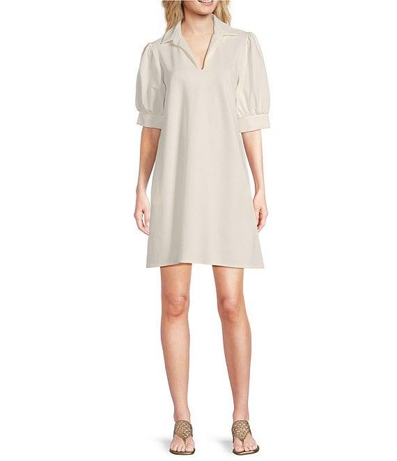 From Jude Connally, this dress features: Jude ponte softly structured knit fabric with a comfortable amount of stretch Shift silhouette V-neckline with point collar Short puffed sleeves Side front pockets Straight hemline Pullover construction Approx. 35" length Rayon/nylon/spandex Dry clean Imported.