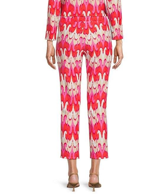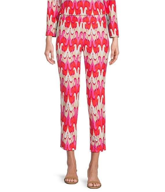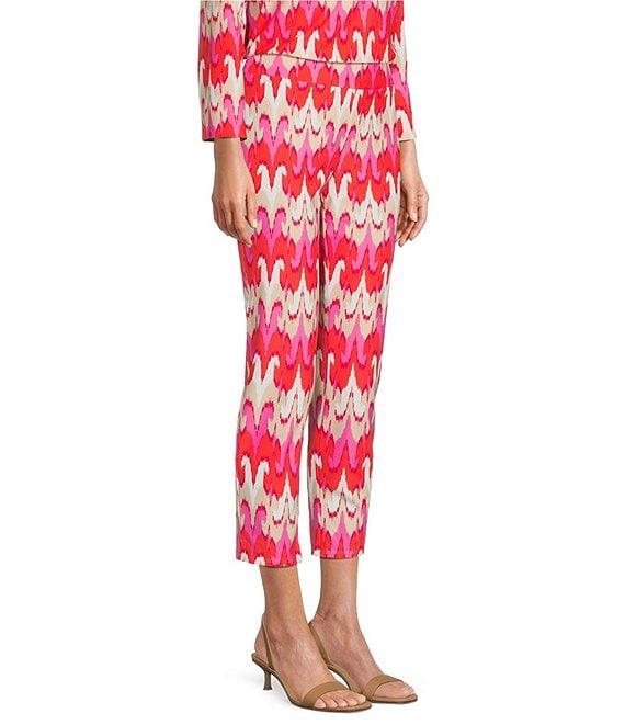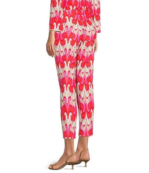 From Jude Connally, these pants feature: Jude cloth stretch knit wrinkle-free fabrication Slim straight leg silhouette with side slits Elasticized waistband Paradise ikat print Cropped length Pull-on construction Approx. 25" inseam Nylon/spandex Machine wash/dry flat Made in the USA.
