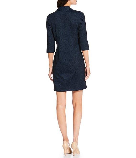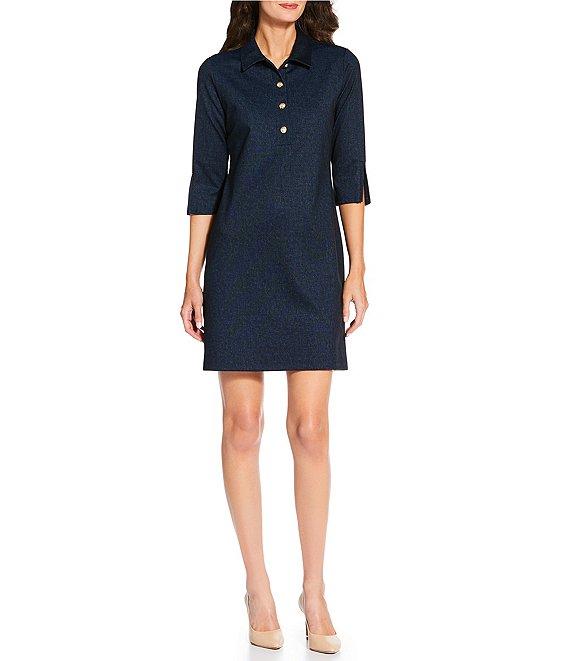 From Jude Connally, this dress features: Denim fabrication Sheath silhouette Point collar neckline Long sleeves with split cuffs Straight hem Gold crest button at front placket Pullover construction Approx. 36" length Polyester/rayon/spandex Machine wash Made in the USA.