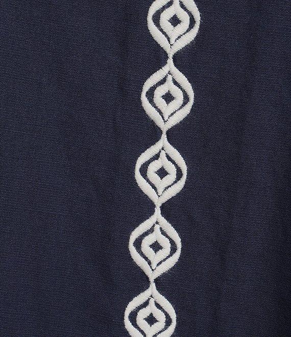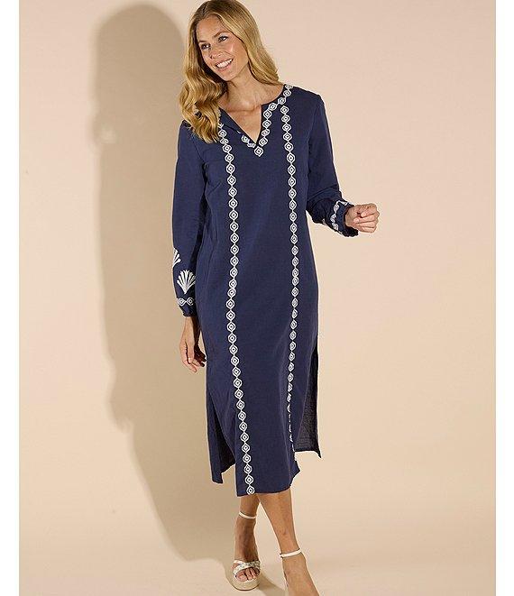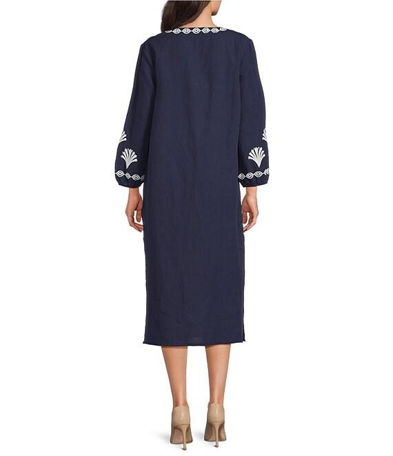 Jude Connally Shauna Linen Blend Embroidered Split V-Neck Long Sleeve Sheath Midi Dress