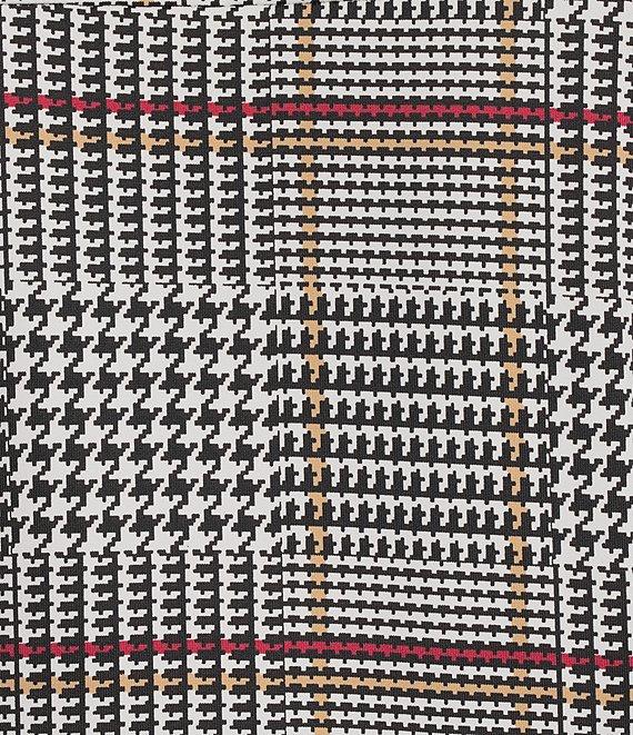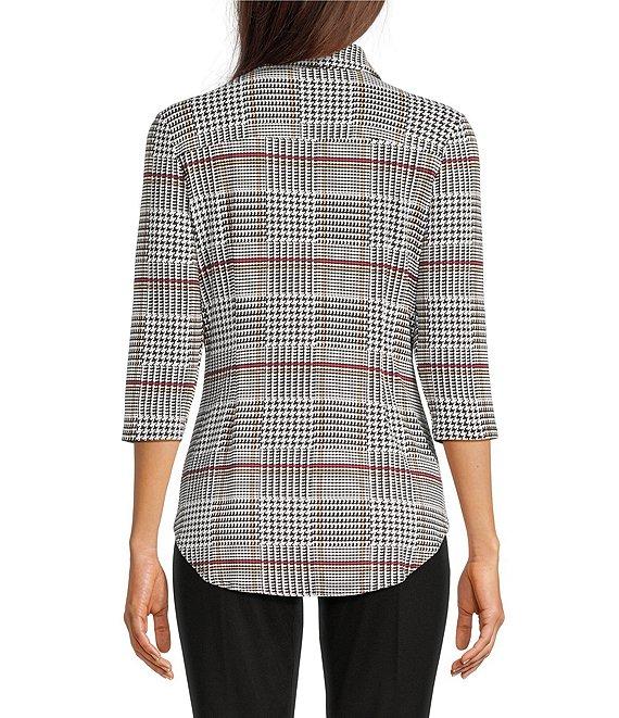 From Jude Connally, this top features: Knit Jude cloth fabrication Glen plaid print Point collar neckline Half button closure 3/4 sleeves Front button patch pockets Shirttail hem Pullover construction Approx. 27" length Nylon/spandex Machine wash/tumble dry Imported.