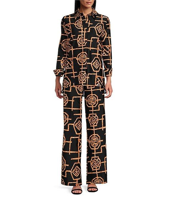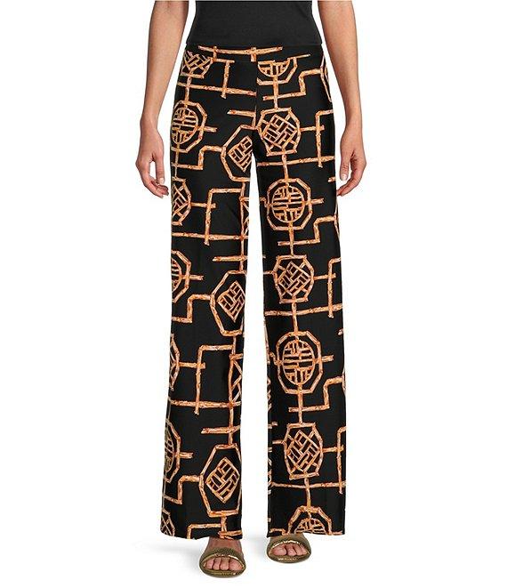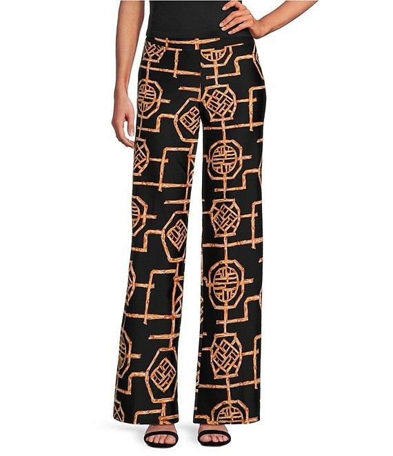 From Jude Connally, these pants feature:Jude cloth stretch knit wrinkle-free fabricationStraight wide leg silhouetteElastic waistband that sits on hipsBamboo lattice printPull-on constructionApprox. 31.5" inseamNylon/spandexMachine wash/line dryMade in the USA.
