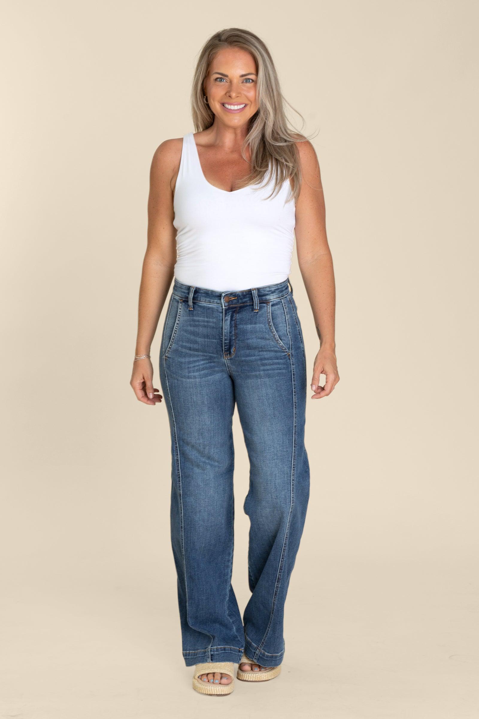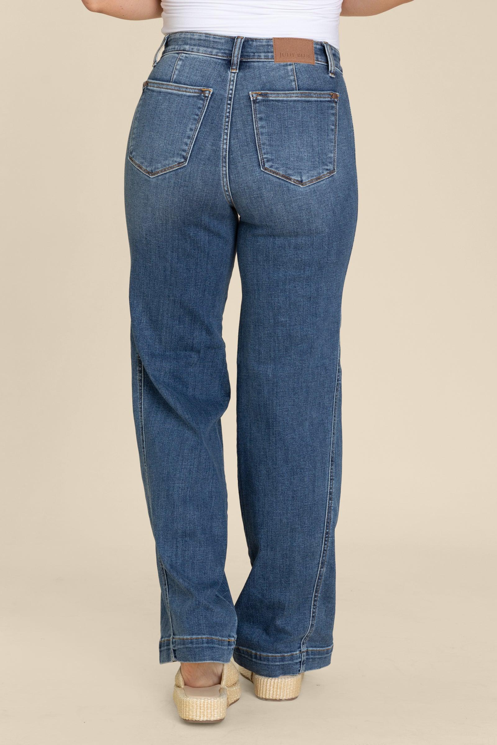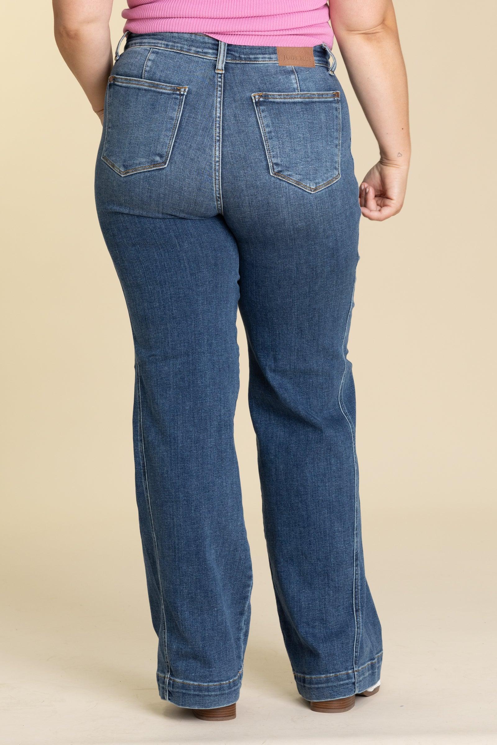 Product Details Color/Wash: Medium Wash Rise: High Rise Style: Wide Leg Jeans Brand: Judy Blue Material and Care 93% Cotton 6% Polyester 1% Spandex Machine Wash Cold Tumble Dry Low Size and Fit 0/24 Rise 10" Inseam 32.5" 1/25 Rise 10.5" Inseam 32.5" 3/26 Rise 10.5" Inseam 32.5" 5/27 Rise 10.5" Inseam 32.5" 7/28 Rise 11" Inseam 32.5" 9/29 Rise 11.5" Inseam 32.5" 11/30 Rise 11.5" Inseam 32.5" 13/31 Rise 12" Inseam 32.5" 15/32 Rise 12.5" Inseam 32.5" 14W=34 Rise 12.5" Inseam 32.5" 16W=36 Rise 12.5" Inseam 32.5" 18W=38 Rise 12.5" Inseam 32.5" 20W=40 Rise 13" Inseam 32.5" Erica is 5’7” and wearing her true 3/26 Courtney is 5’8” and wearing her true 9/29