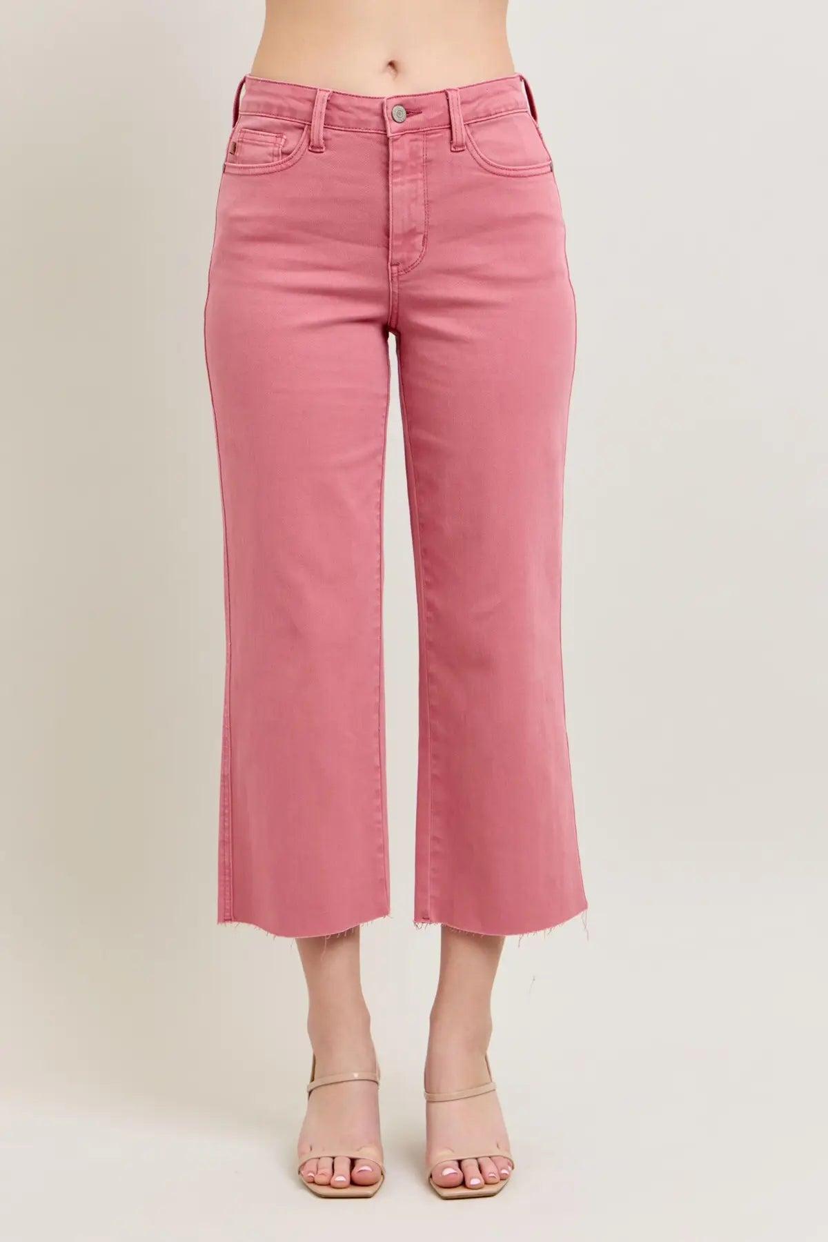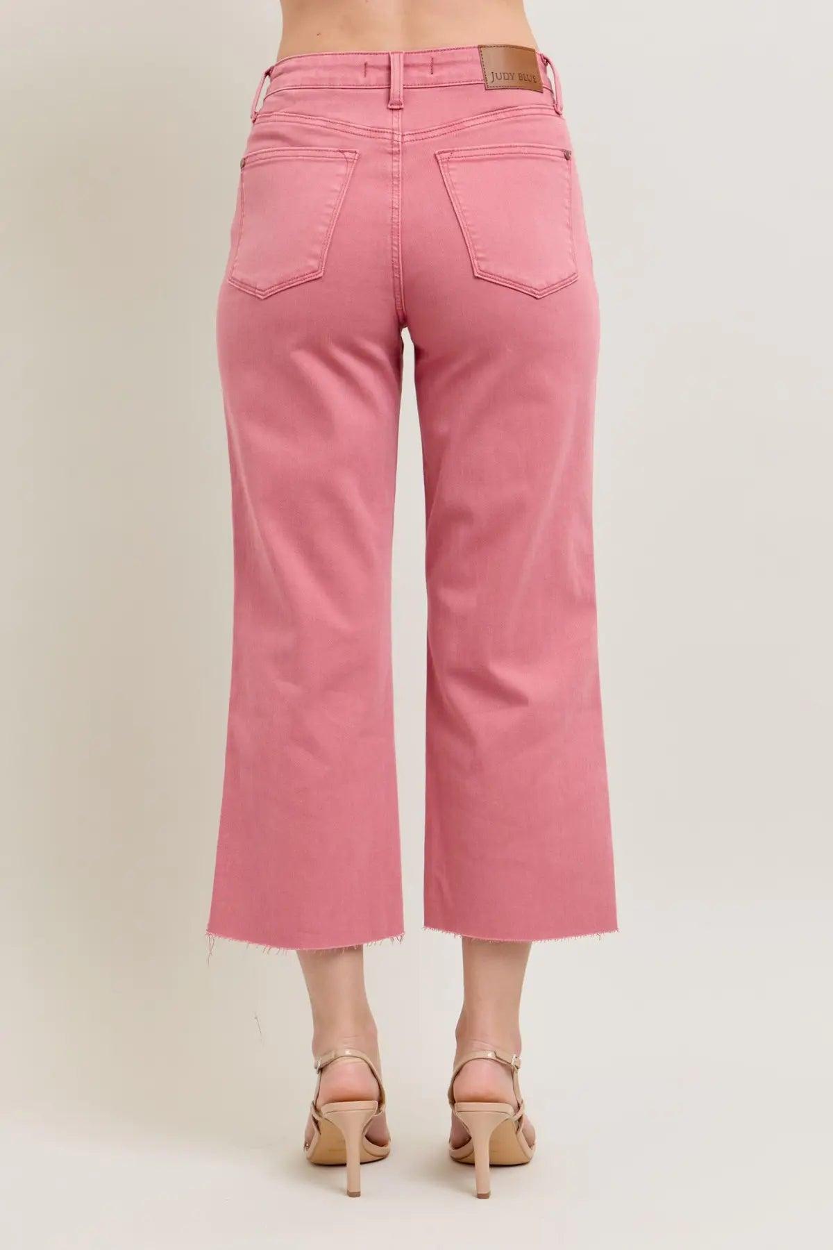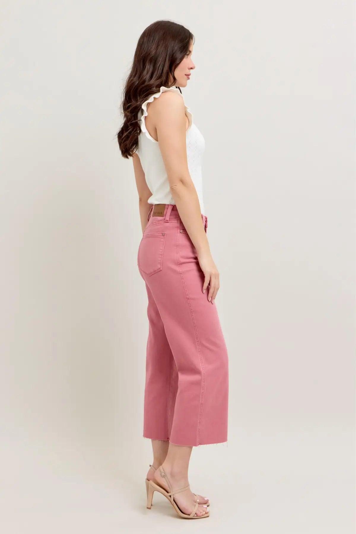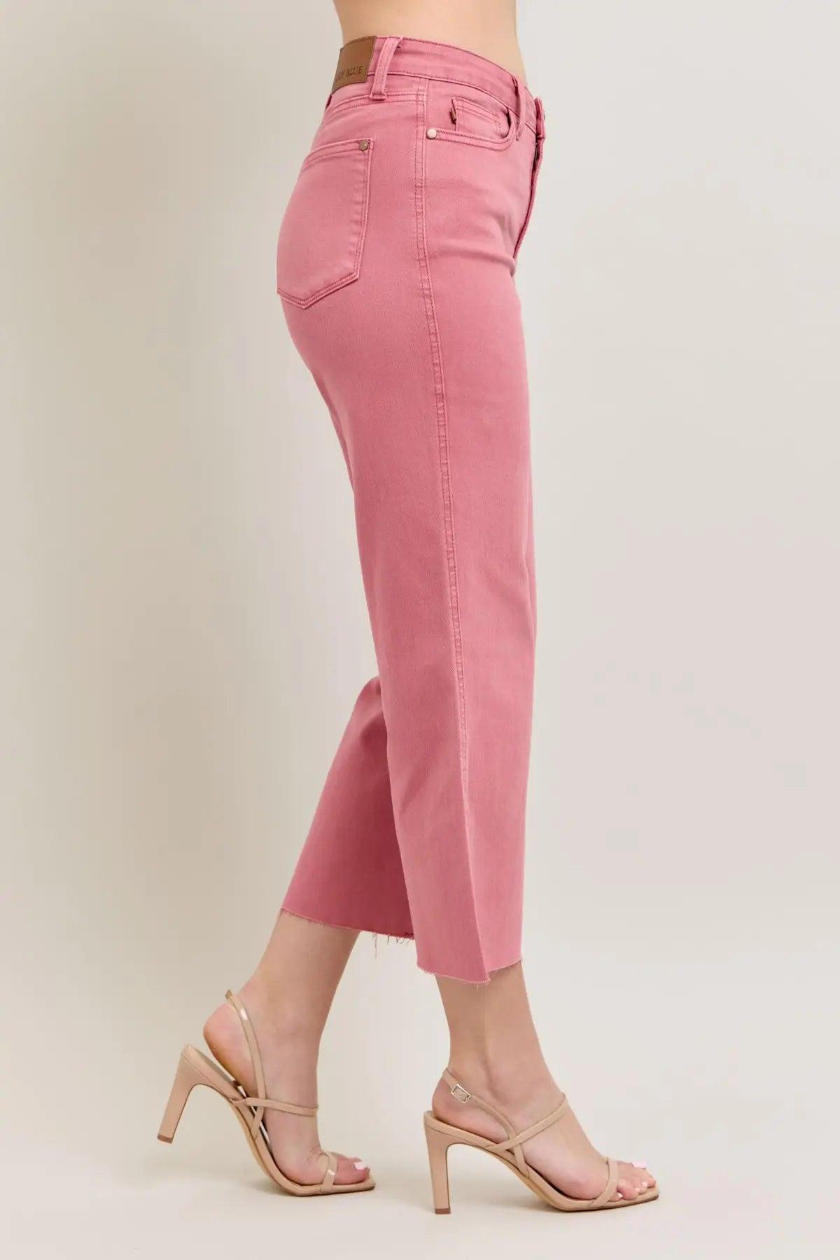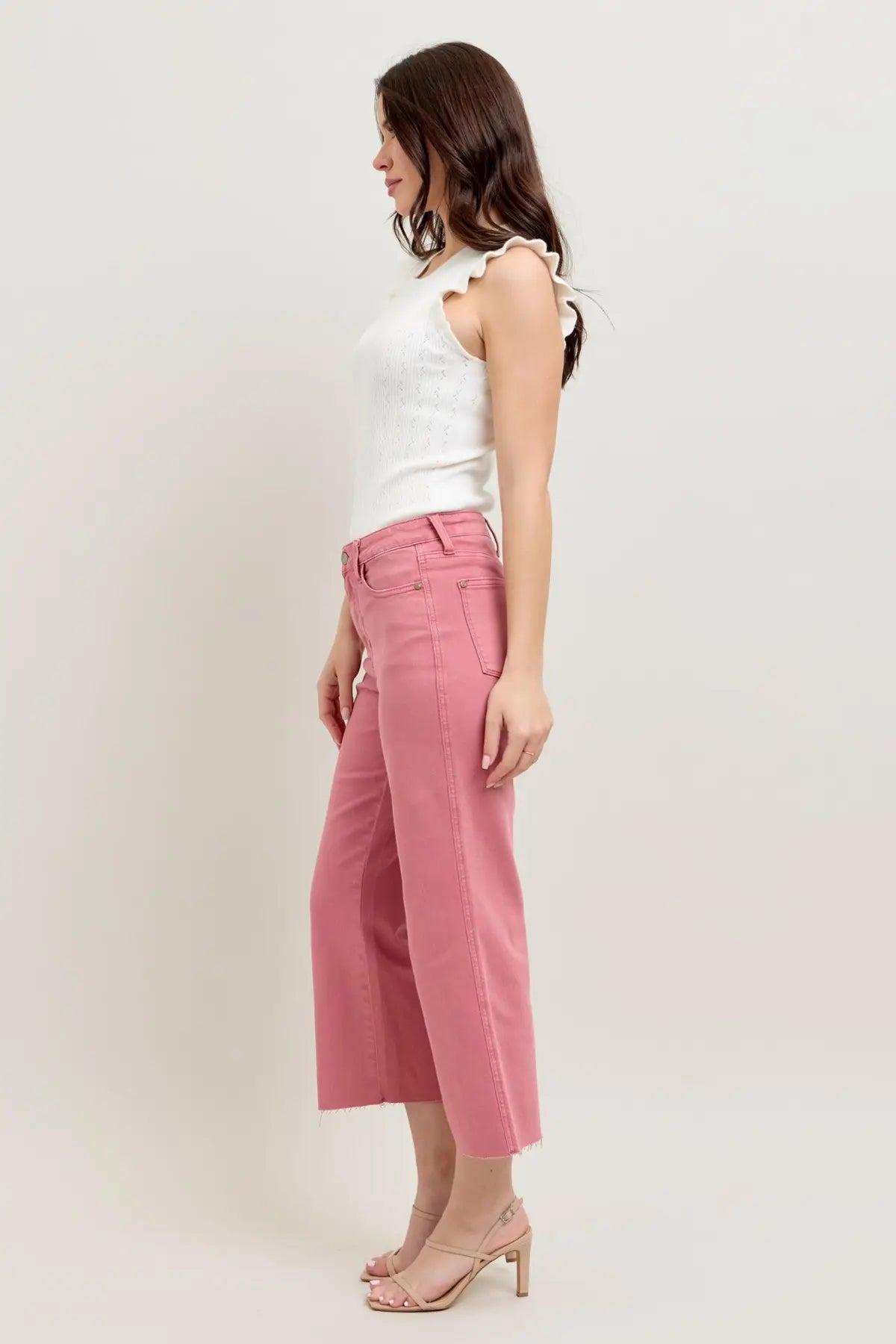 JUDY BLUE HW ROSE GARMENT DYED RAW HEM CROP WIDE JEANS
