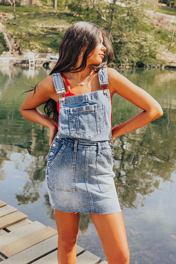 - Stay cute as can be in this sweet skirtall! - Unlined stretchy denim material with subtle fading - A square cut neckline - Adjustable length straps with front buckle closure and a racerback cut - A functional kangaroo pocket - An open back - Functional front and back pockets - Three buttoned closure at the sides - Belt loops - A figure flattering skirtall silhouette that ends in an unfinished hemline Measurements S : Bust 10.5", Hip 33", Length 25.5", Waist 26". M : Bust 11", Hip 37", Length 27.5", Waist 28". L : Bust 11.5", Hip 38", Length 28", Waist 30".