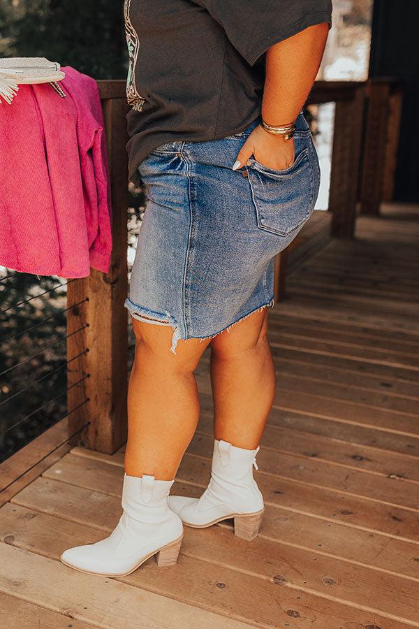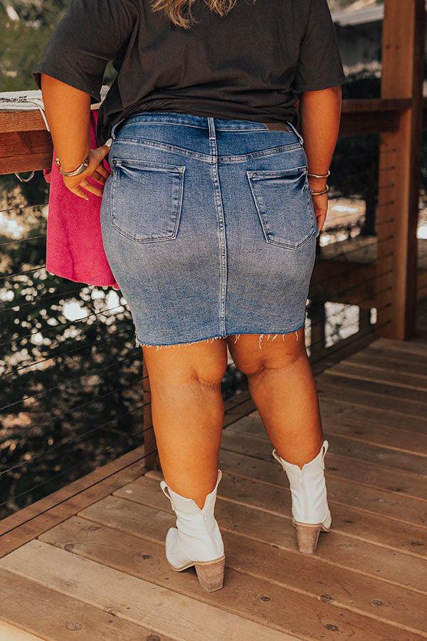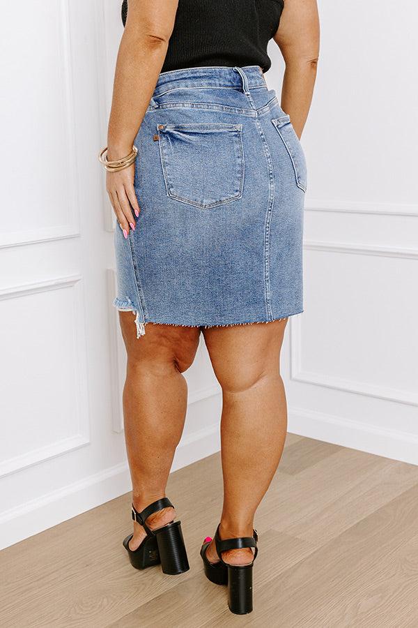 - This distressed denim skirt was made for your trendy wardrobe! - Unlined denim material with distressed detailing - A rigid non-stretch front and a stretchy back - A high waistline with belt loops, a hidden zip fly, and button closure - Functional front and back pockets - A relaxed yet flattering silhouette that ends in a raw cut hemline with distressed detail Measurements 1XL : Hip 43", Length 20.5", Waist 36". 2XL : Hip 45", Length 21.5", Waist 38". 3XL : Hip 47", Length 22", Waist 40".