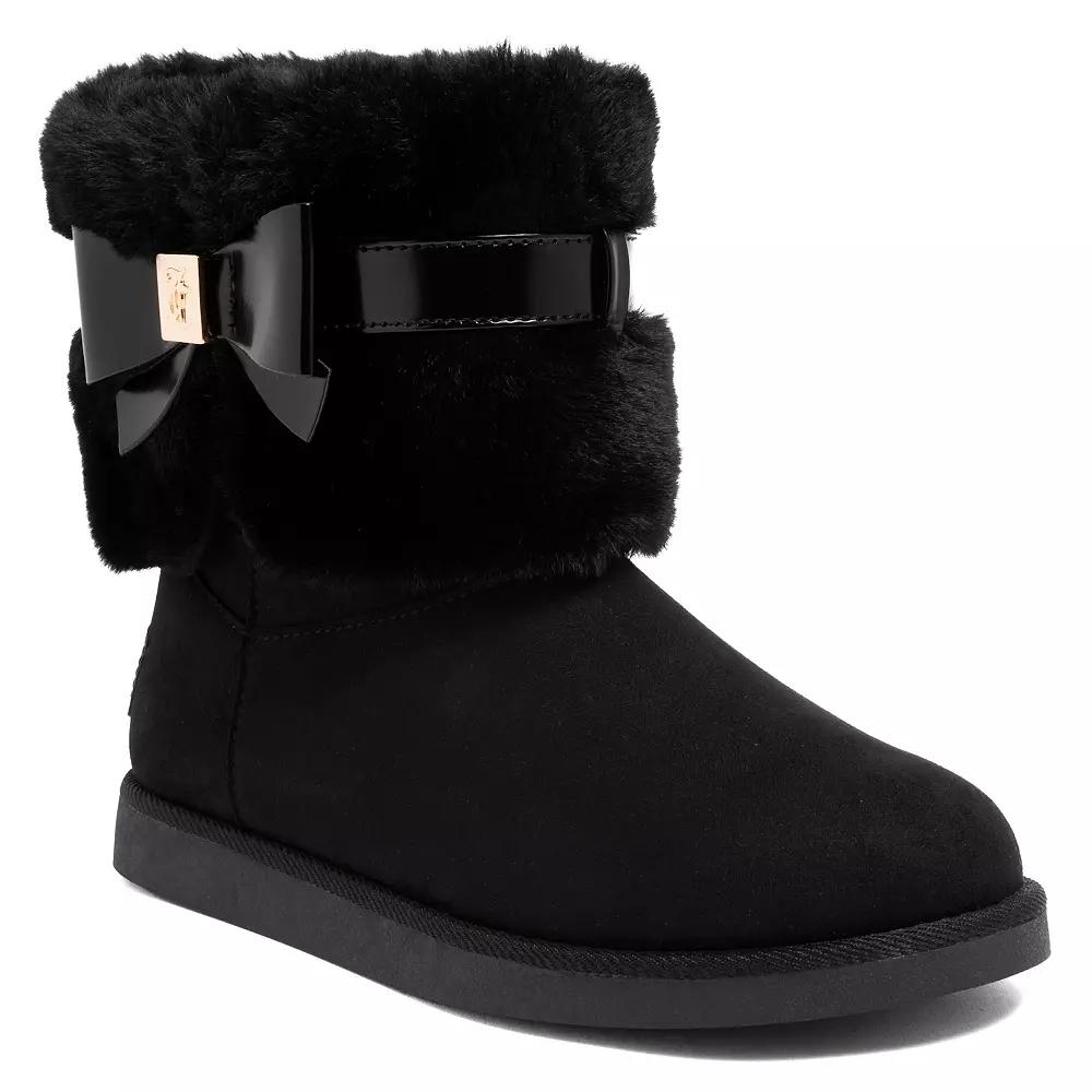 Slip into winter wonderland magic with these charming ankle boots from Juicy by Juicy Couture that blend coziness and style effortlessly. The soft faux fur lining will keep your feet toasty, while the adorable bow detail adds a playful flair, making them the perfect companion for frosty strolls or cozy gatherings. Click this FOOTWEAR GUIDE to find the perfect fit and more! - https://www.kohls.com/feature/shoesizeguide.jsp. FEATURES: Flat insole has no built-in arch support, Pair with insert for added comfort. FIT & SIZE: Ankle boot shaft detail, Boot shaft height: 6.5-in., Boot shaft circumference: 14-in. DETAILS: Pull-on closure, Flex groove outsole, Round toe, Platform height: 0.5", Imported. MATERIAL & CARE: Manmade fabric upper and midsole, Manmade rubber outsole, Faux fur lining, Foam footbed, Product contains faux fur, Spot clean. Size: 7 Med. Color: Black. Gender: female. Age Group: adult. Material: SYNTHETIC.