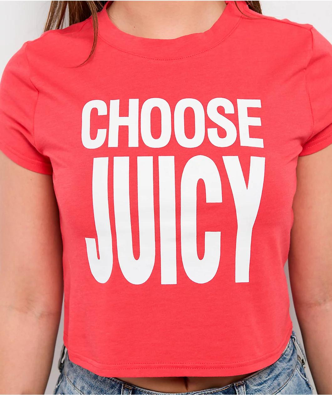 Declare loyalty to your favorite Y2K brand with the red Choose Juicy crop t-shirt from Juicy Couture. The crop top features bold white text across the text reading "Choose Juicy" for an unmissable message. With a slim fit, the baby tee offers a flatt