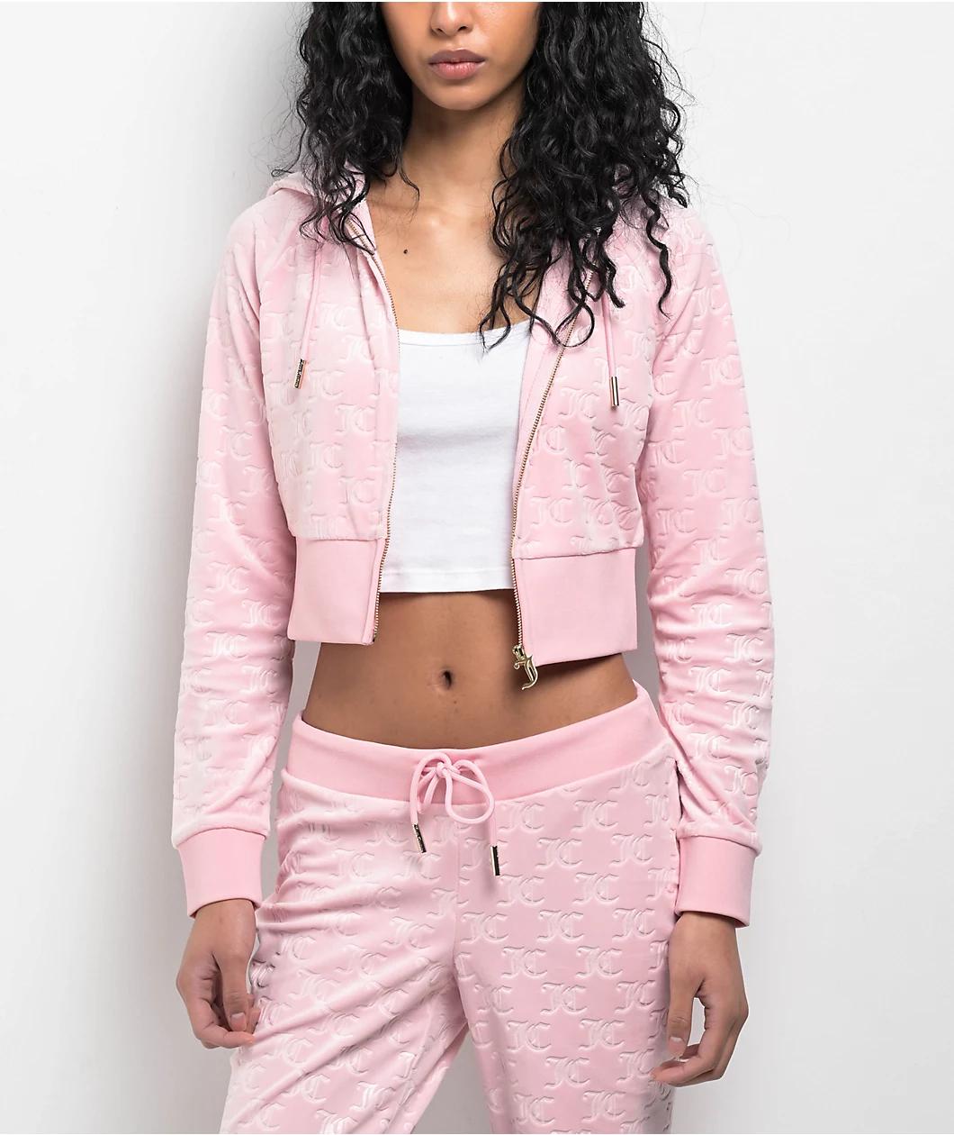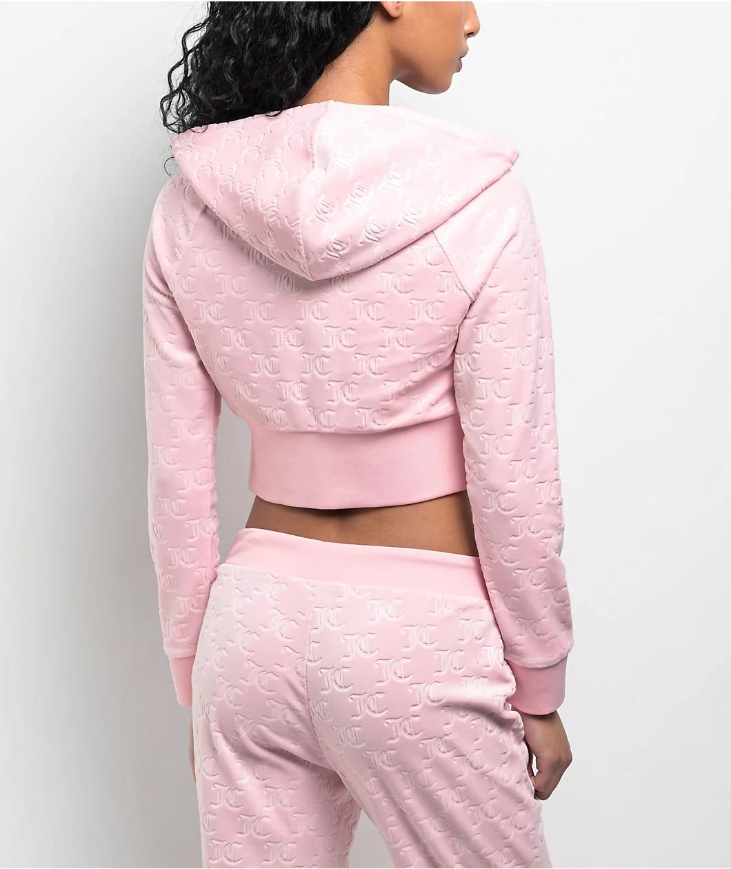 Add a classic Y2K touch to any outfit with the Embossed velour crop zip hoodie from Juicy Couture, arriving in a light "Whisper" pink and featuring a raglan corset design for a flattering slim fit. Embossed Old English branding throughout gives the t