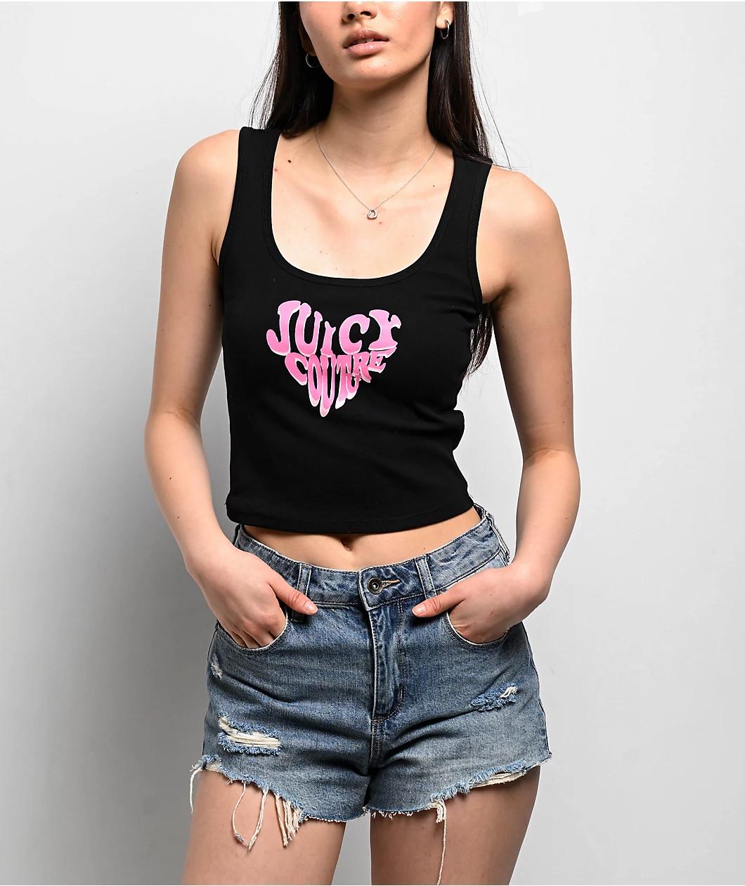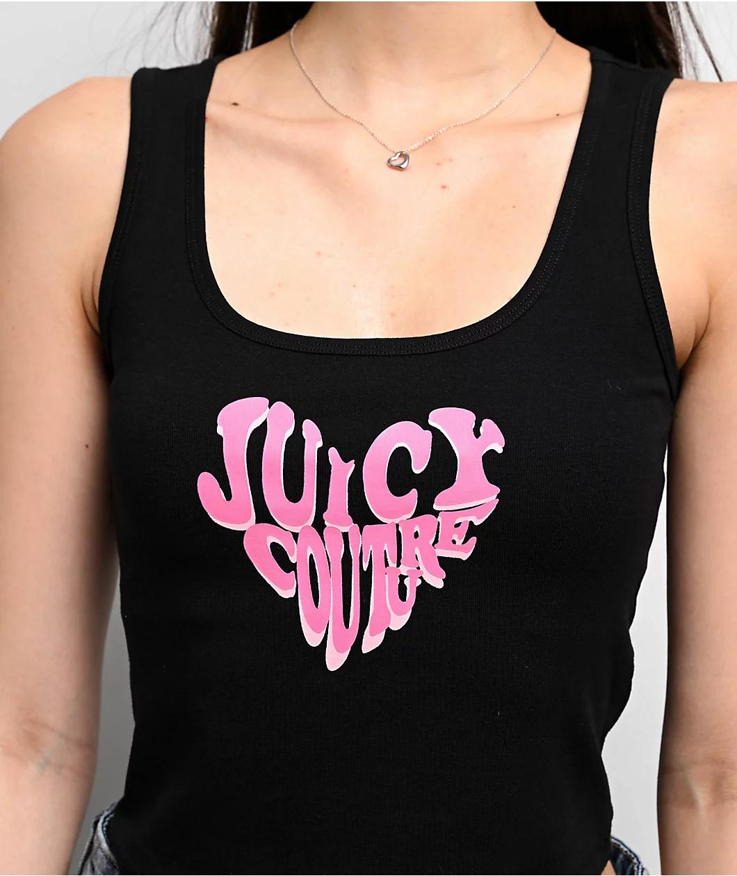 Juicy Couture presents the Heart tank top in a black "Licorice" colorway with a pink screen-printed graphic on the front. Providing a classic 2000s vibe, this cropped tank has branding arranged in a heart-shape motif for a cute look. Made from a cozy