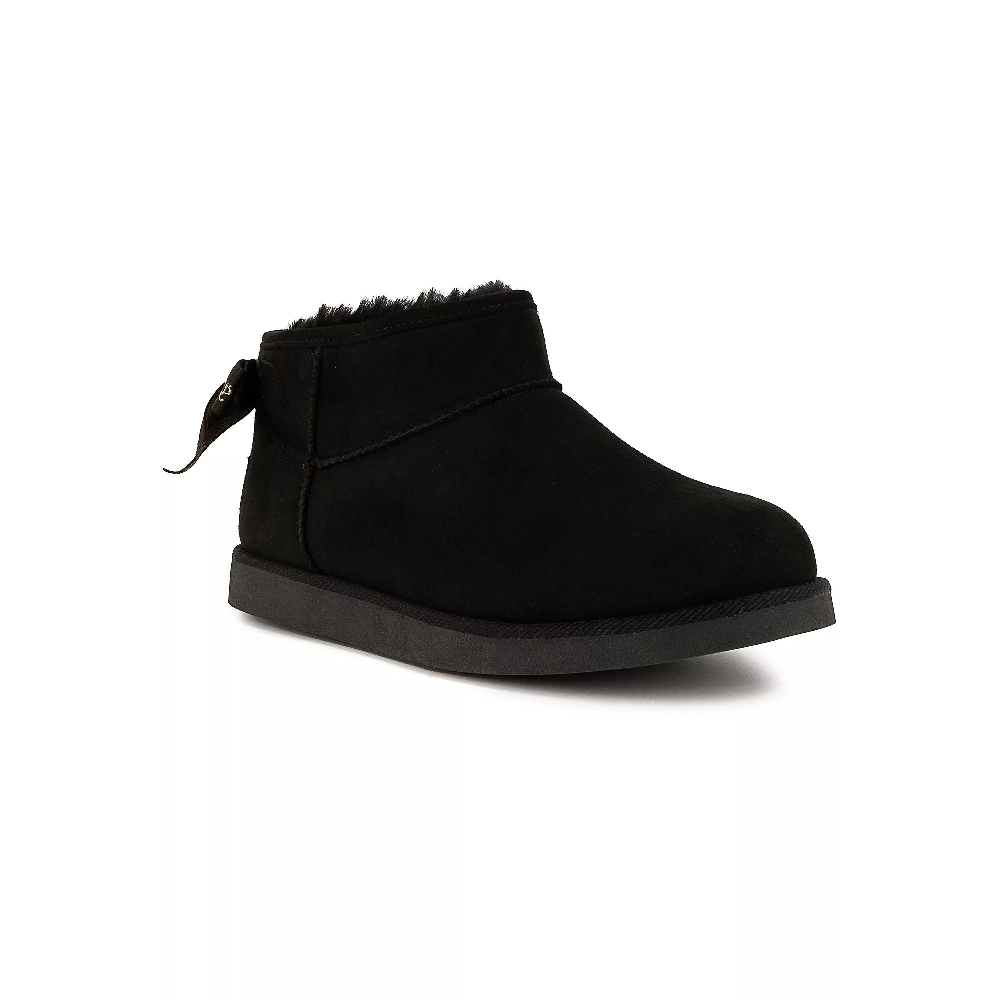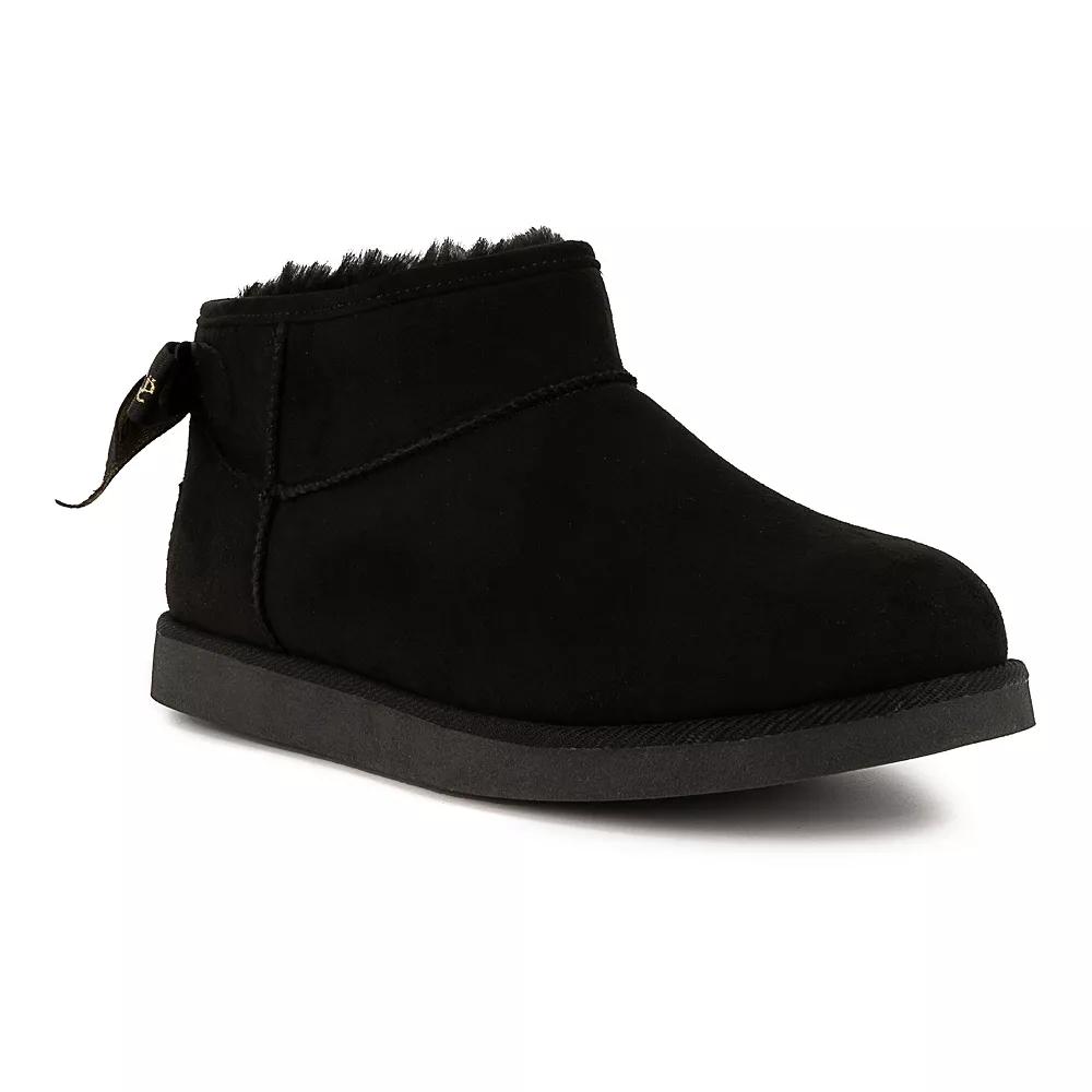 Stay cute and comfortable in these Juicy Couture Kelsey 2 women's cold weather boots. Click this FOOTWEAR GUIDE to find the perfect fit and more! - https://www.kohls.com/feature/shoesizeguide.jsp. FEATURES: Bow detail, Ankle height, Durable rubber outsole, Pull-on for easy on and off. DETAILS: Manmade upper and lining, Foam midsole, TPR outsole, Round toe, Pull-on, 0.5-in. heel, 1-in. shaft, 12.5-in. circumference, Spot clean, Imported. Size: 11. Color: Black Gold. Gender: female. Age Group: adult. Material: OTHER MATERIAL.