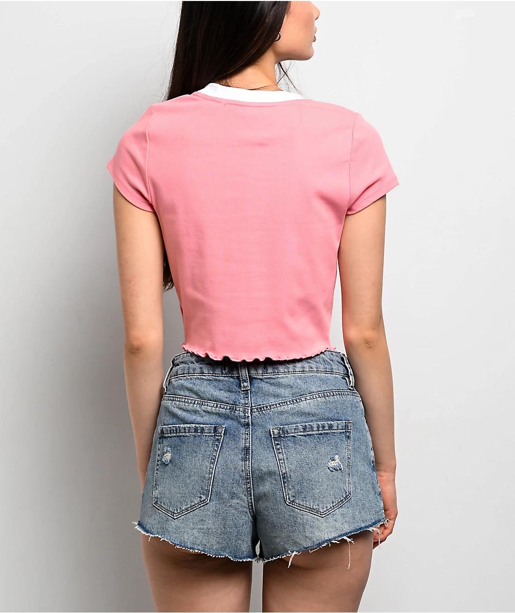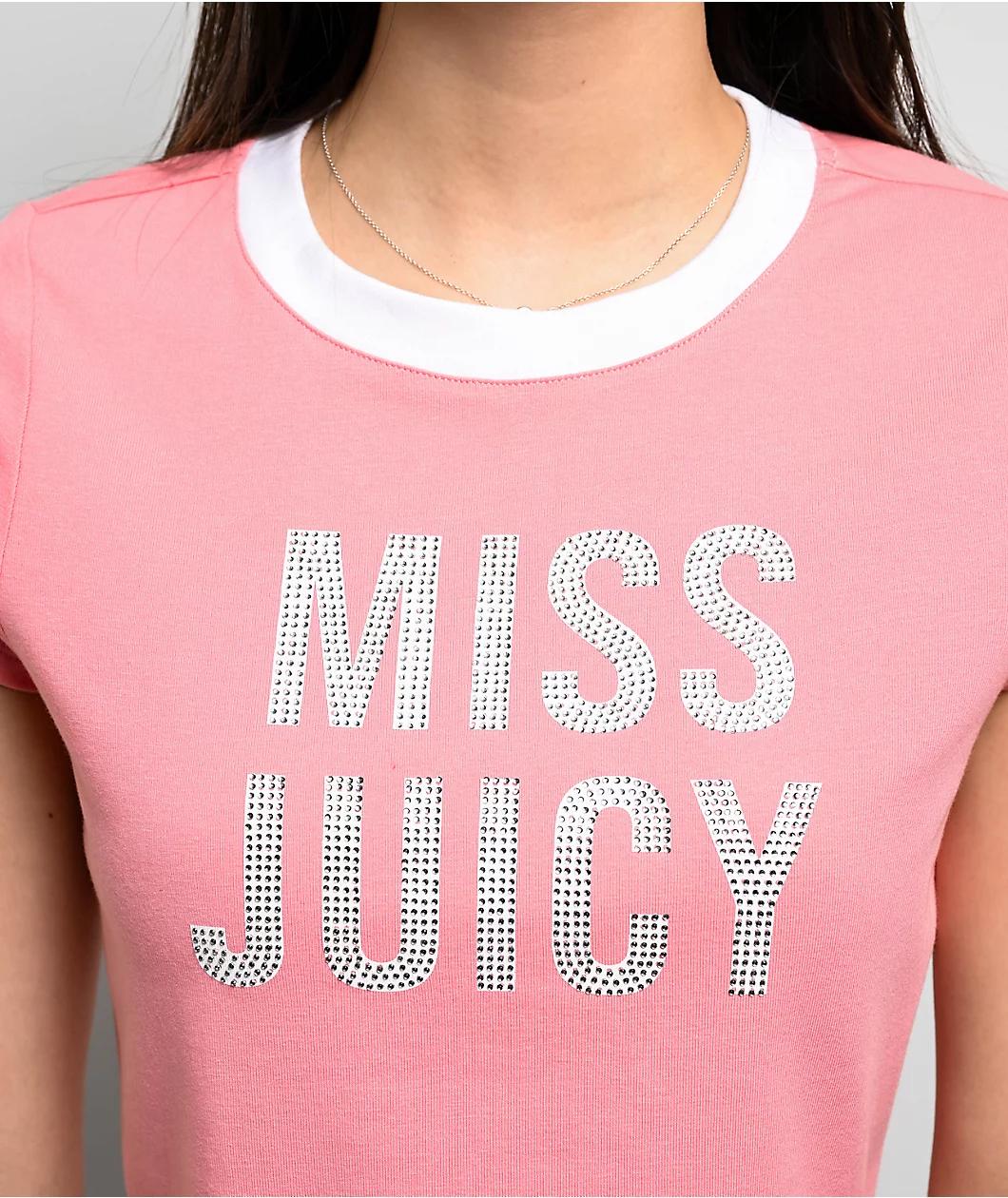 Add a cute Y2K look to your outfit with the Miss Juicy crop t-shirt from Juicy Couture in a pink colorway. Screen-printed on the front of the tee is "Miss Juicy" adorned with shiny rhinestone details for a nostalgic flair. This cropped shirt comes fi