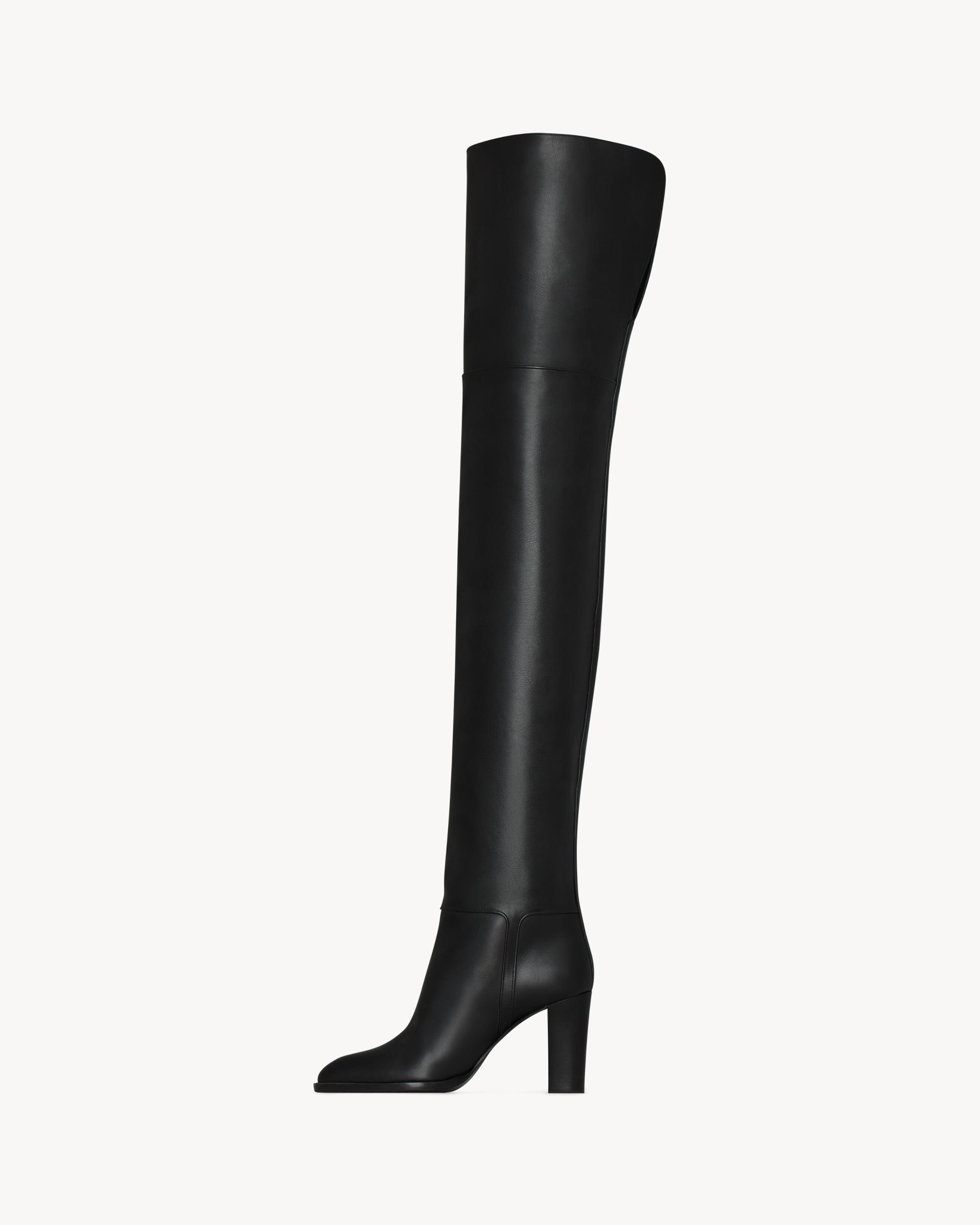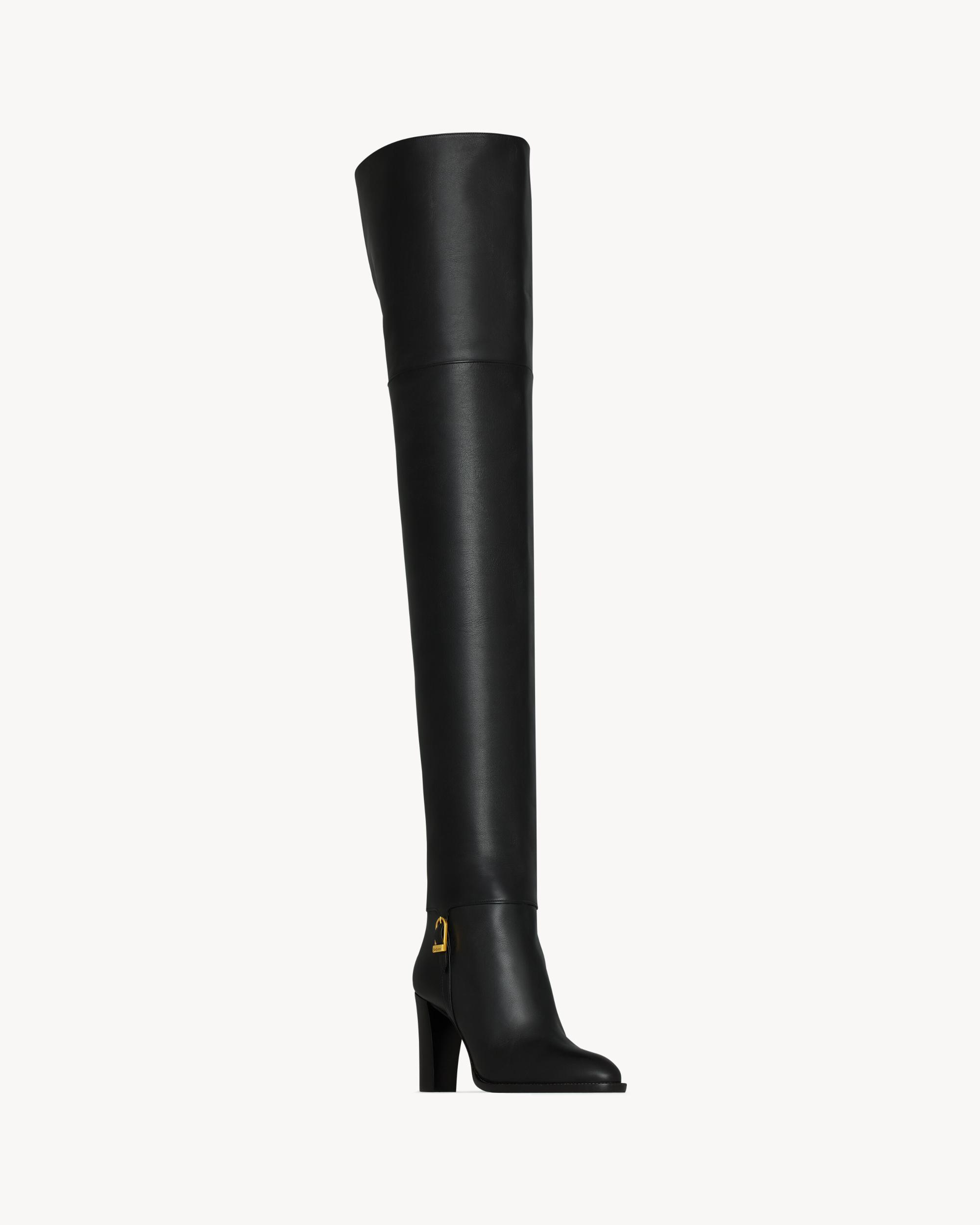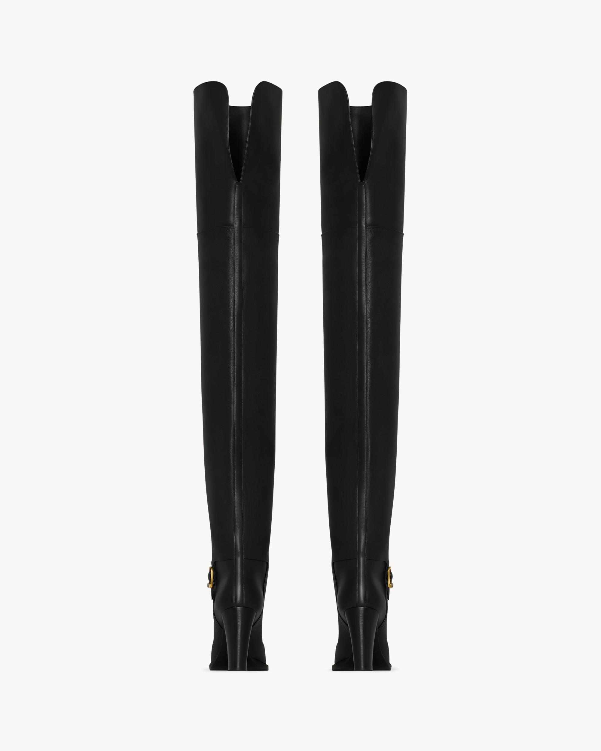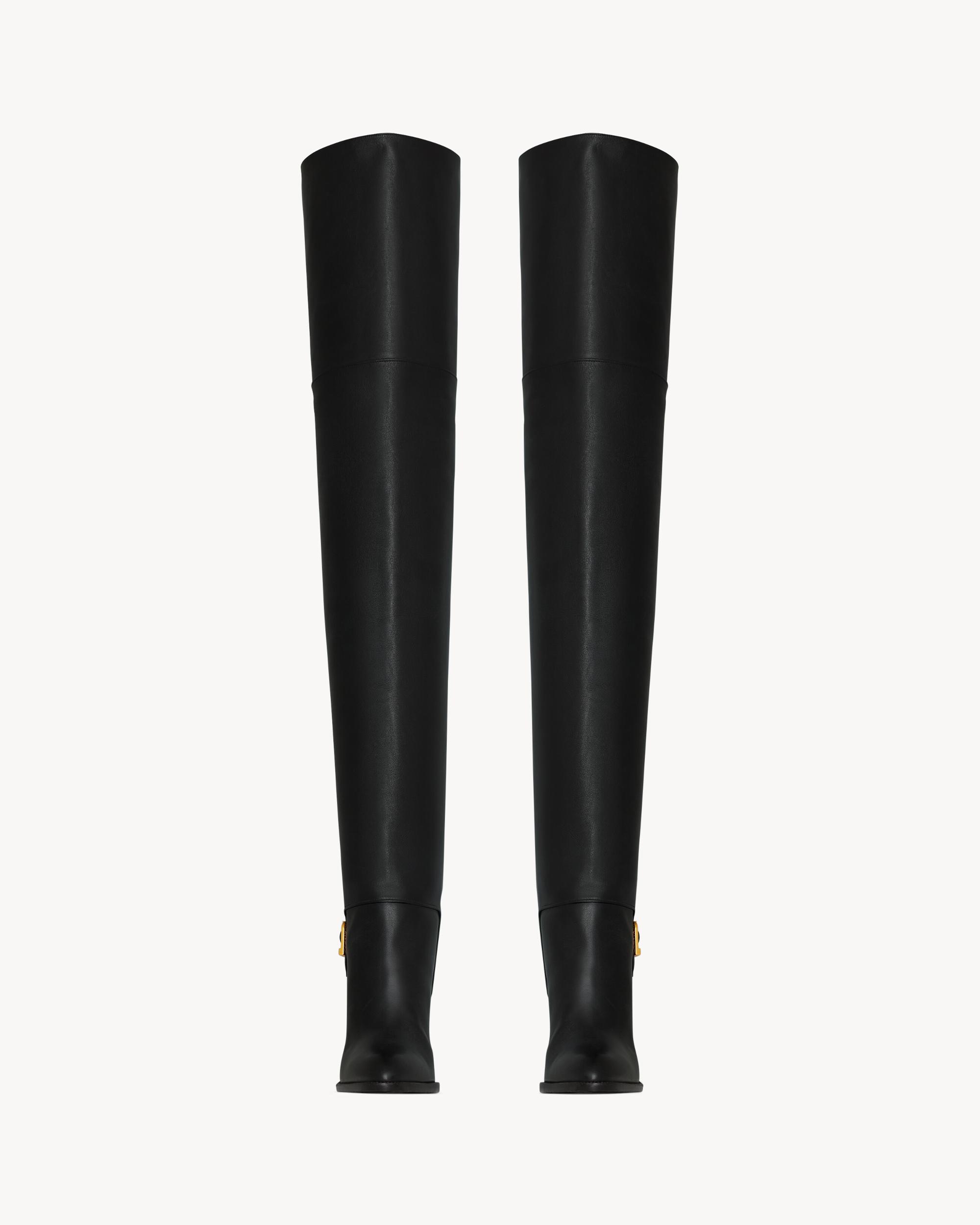 over-the-knee boots with a square toe and block heel, featuring a SAINT LAURENT engraved buckle and rear thigh split.