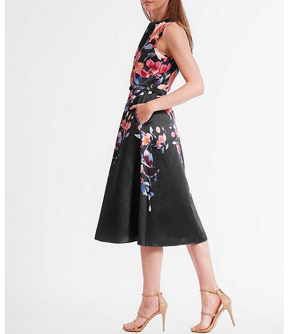 From Julia Jordan, this dress features: Printed mikado fabrication A line silhouette Boat neckline Sleeveless Floral print Belted Side seam pockets Invisible zip closure Approx. 40.5" length Polyester Dry clean Imported.