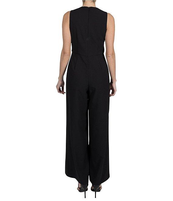 From Julia Jordan, this jumpsuit features: Kors crepe fabrication Asymmetrical neckline Sleeveless Pleated shoulder Wide leg Fully lined Hook & eye/zipper closure Approx. 31" inseam Polyester/spandex Machine wash Imported.