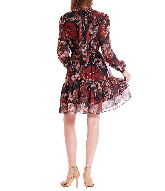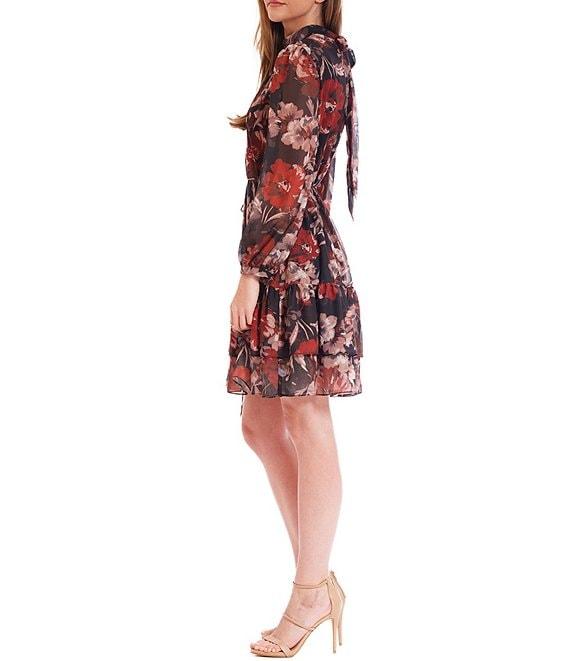 From Julia Jordan, this dress features: Printed chiffon fabrication A line silhouette Collar neckline Long sleeves Ruffle collar Self tie sash Button front closure Approx. 37" length Polyester Dry clean Imported.