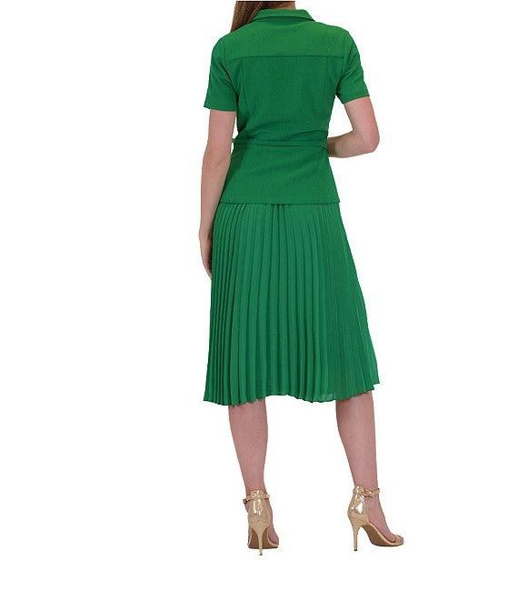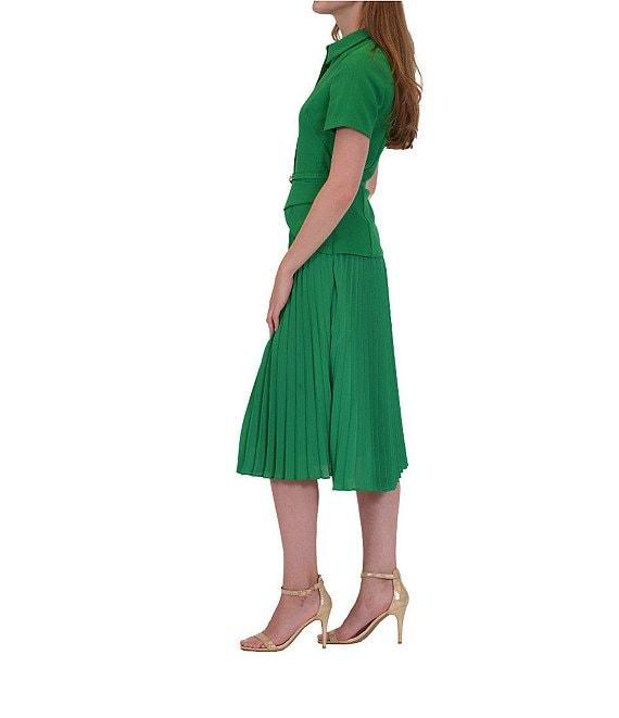 Julia Jordan Mix Media Point Collar Neck Short Sleeve Pleated Belted A-Line Midi Dress