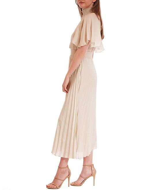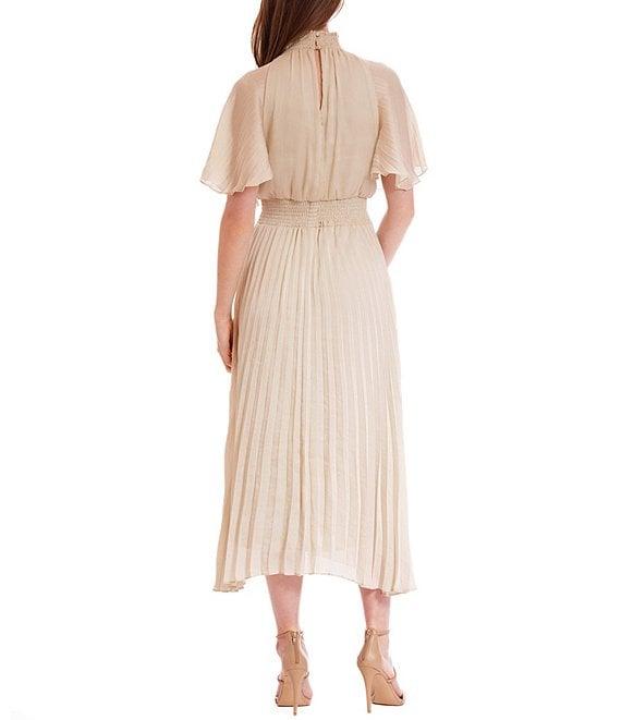 From Julia Jordan, this dress features: Blouson silhouette Satin yoryu fabrication Mock neckline with keyhole back detail Short flutter sleeves Smocked waist seam Pleated skirt Lined Button back closure Approximate length 35" Polyester Hand wash Imported.