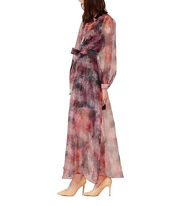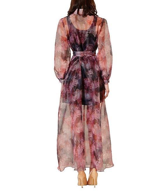 From Julia Jordan, this dress features: Printed organza fabrication Shirt dress silhouette Collar neckline Long illusion sleeves Self tie belt Lined Button front closure Approx. 57" length Polyester Dry clean Imported.