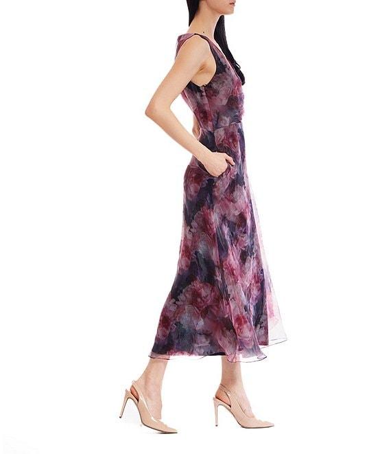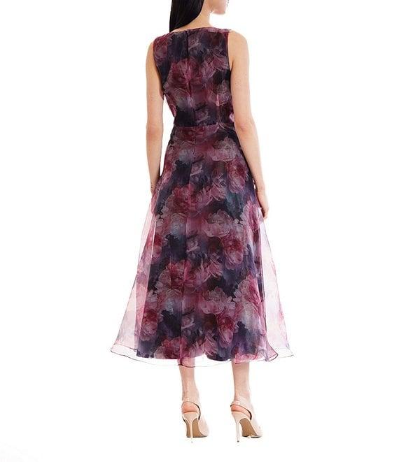 From Julia Jordan, this dress features: Printed organza fabrication A-line silhouette V neckline Sleeveless Side seam pockets Invisible zip closure Approx. 48.5" length Polyester Dry clean Imported.
