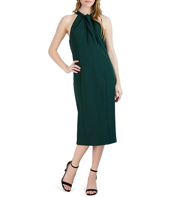 From Julia Jordan, this dress features: solid scuba fabricationa-line silhouette halter necklinesleevelessmeasured to hit at knee length lined dresscenter back zip closureapprox. 41" from shoulder to hem polyester/spandexmachine wash cold/tumble dry lowImported.