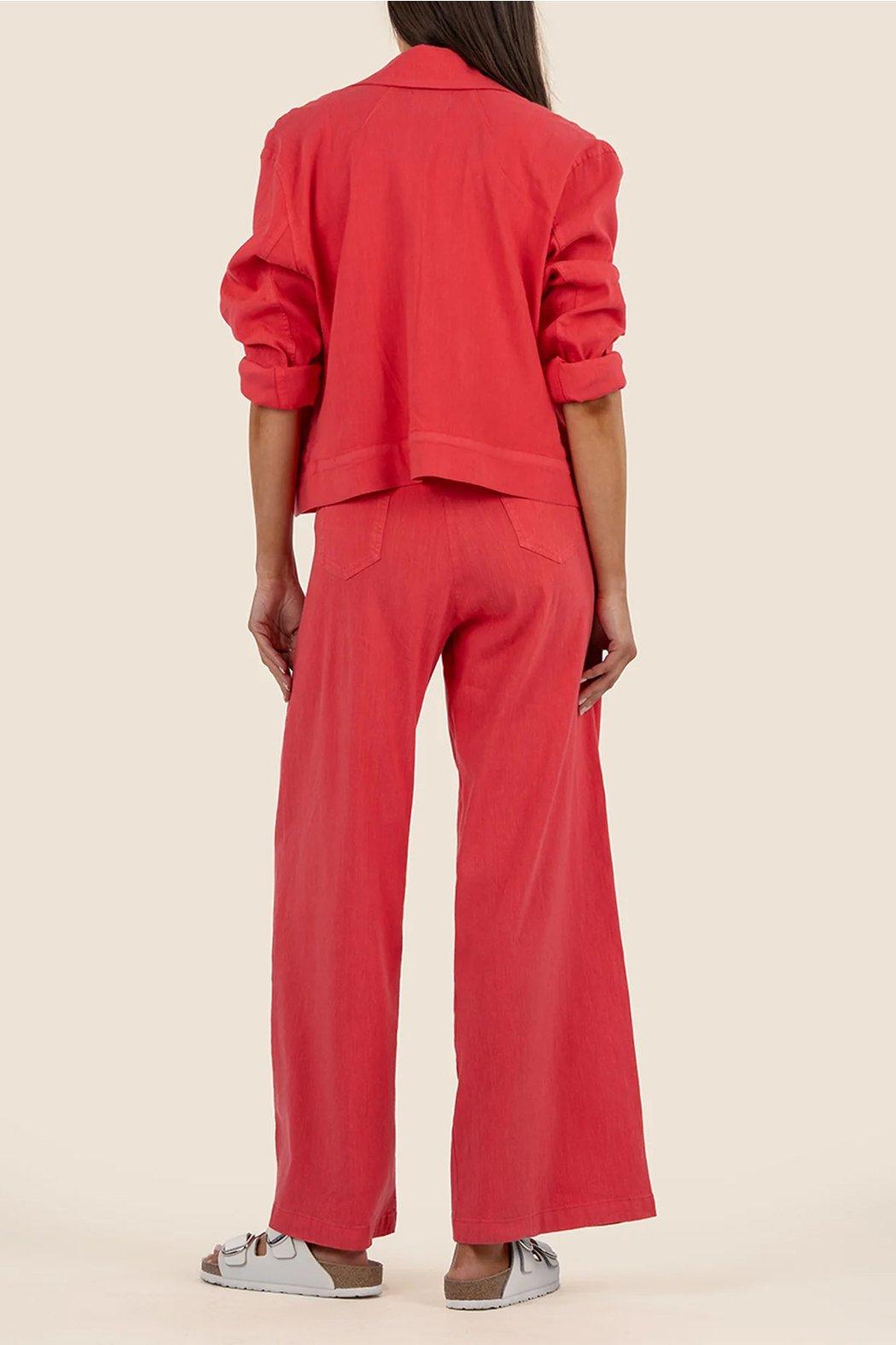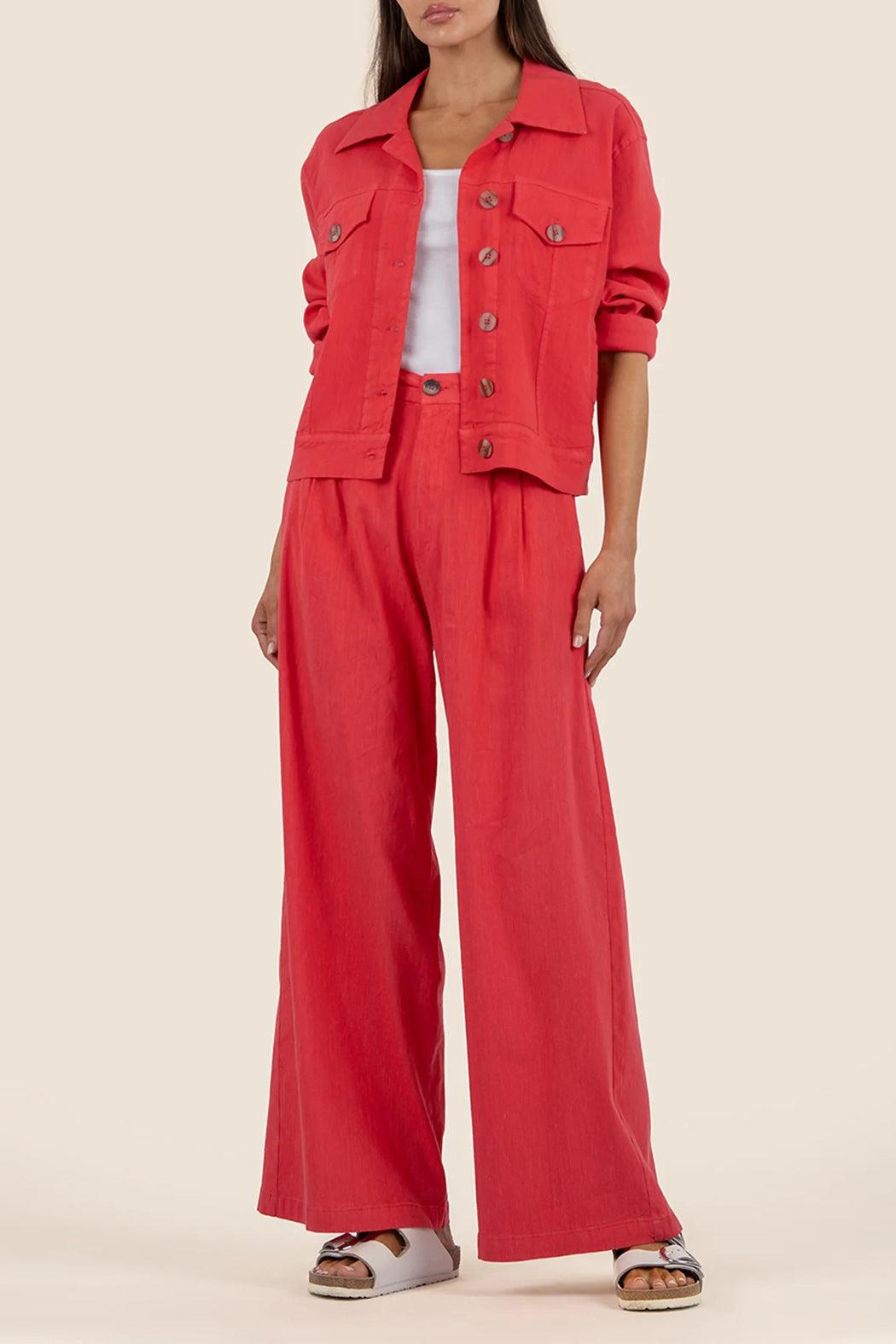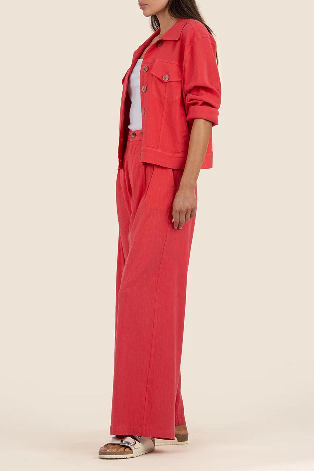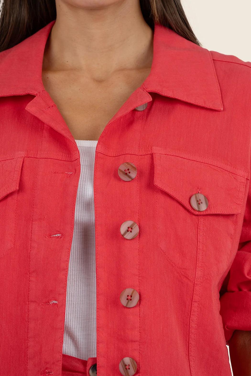 This linen jacket adds a stylish pop of color to any outfit. Featuring a button-down closure and front pockets with buttons, it blends versatility with a bold, head turning color choice. Layer it over your favorite tees and tanks and pair with white or blue jeans.
