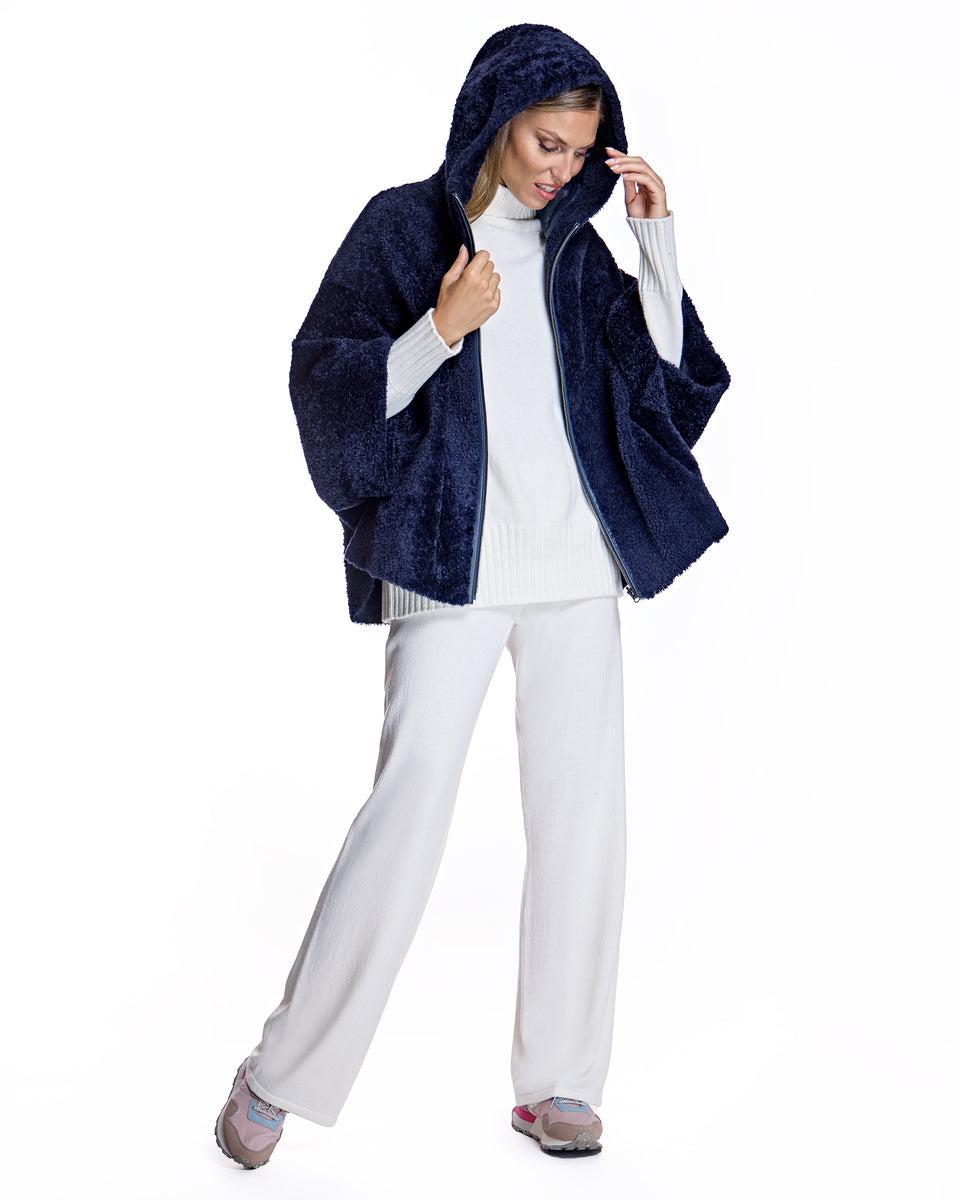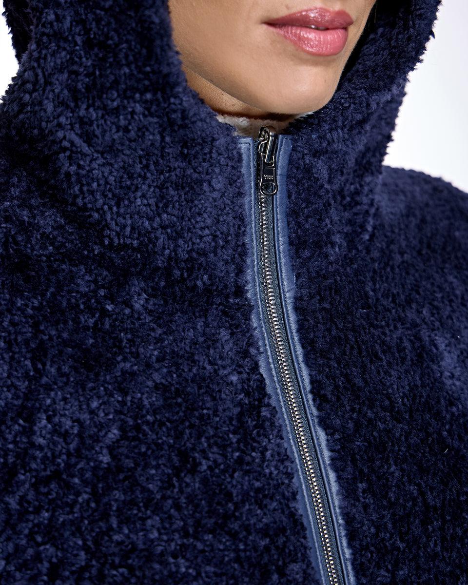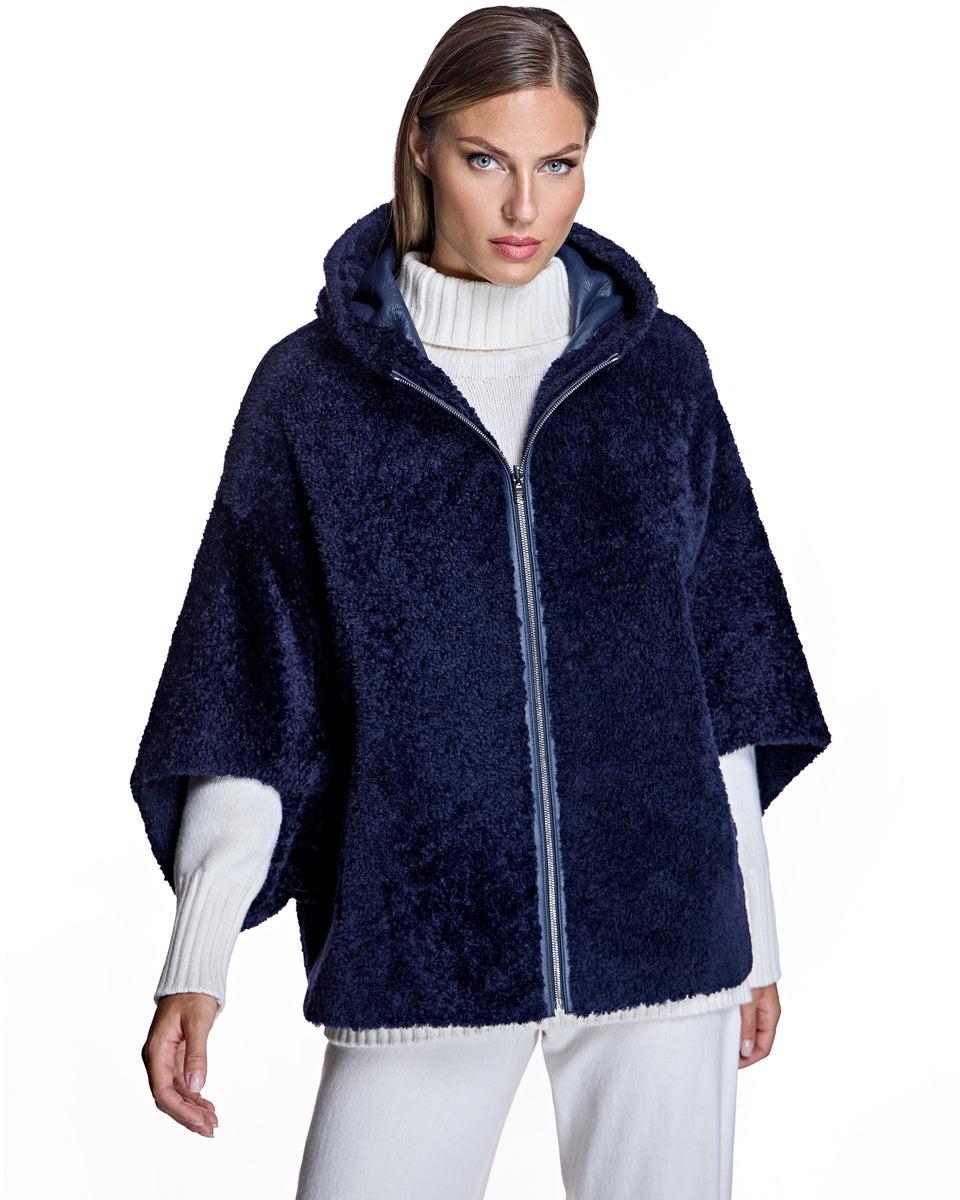 Featuring a functional hood and sleek zipper closure, the cape-style jacket drapes beautifully with a longer back length for added coverage and modern appeal. Crafted from premium dyed lamb shearling sourced from South Africa, this piece delivers warmth, softness, and elevated texture in a contemporary design.