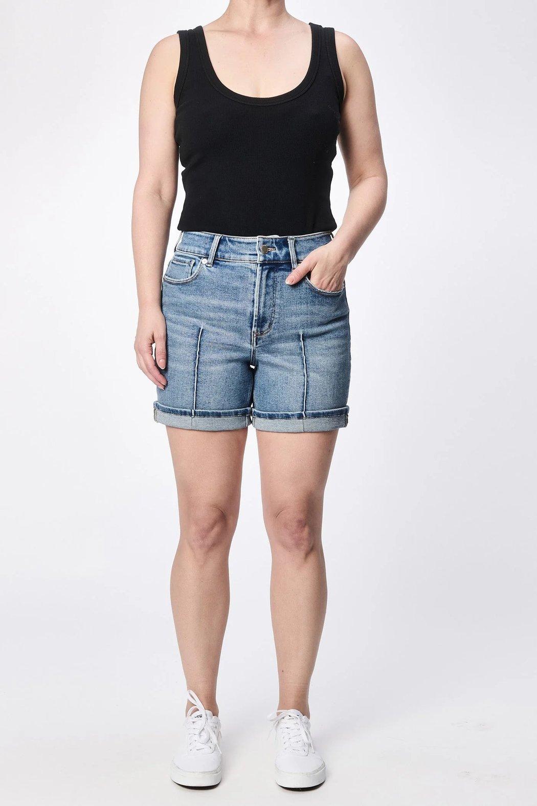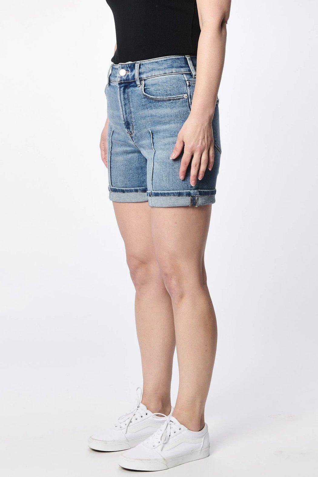 The perfect blend of style and comfort with our Julian shorts in medium wash, featuring a mid rise and a chic cuffed hem for a flattering silhouette.