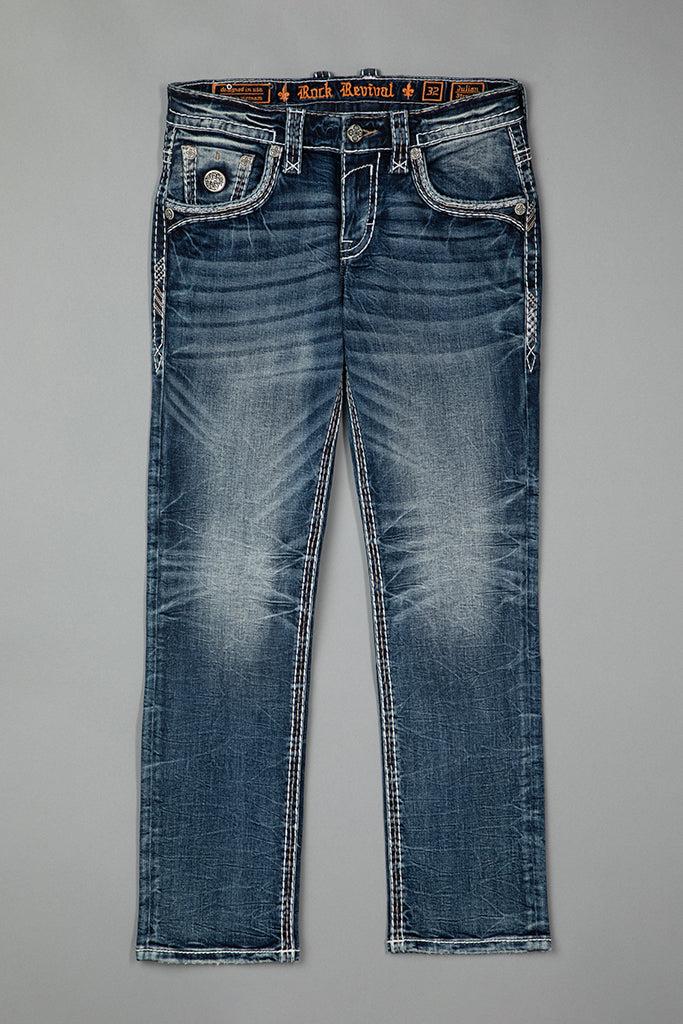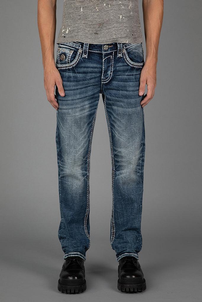 Pewter off-white brushed hardware throughout. Light whiskering on front and back legs with grey leather accents. Stitched inverted Fleur de Lis back pockets and white-brown snake print leather belt loop patch. Designed with care and creativity in Los Angeles, California.
