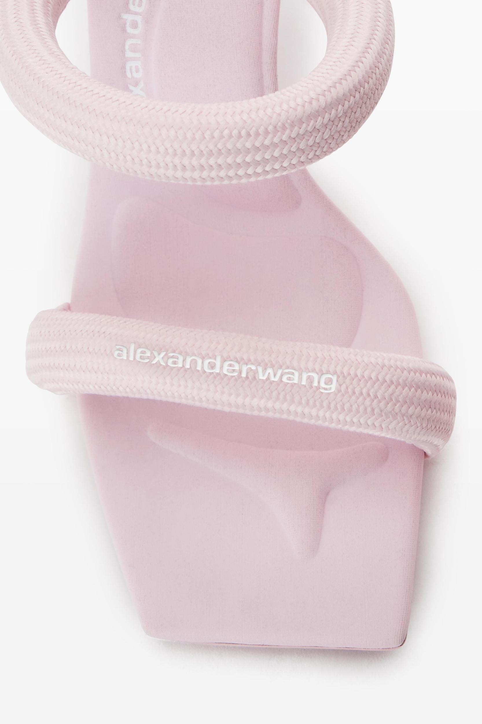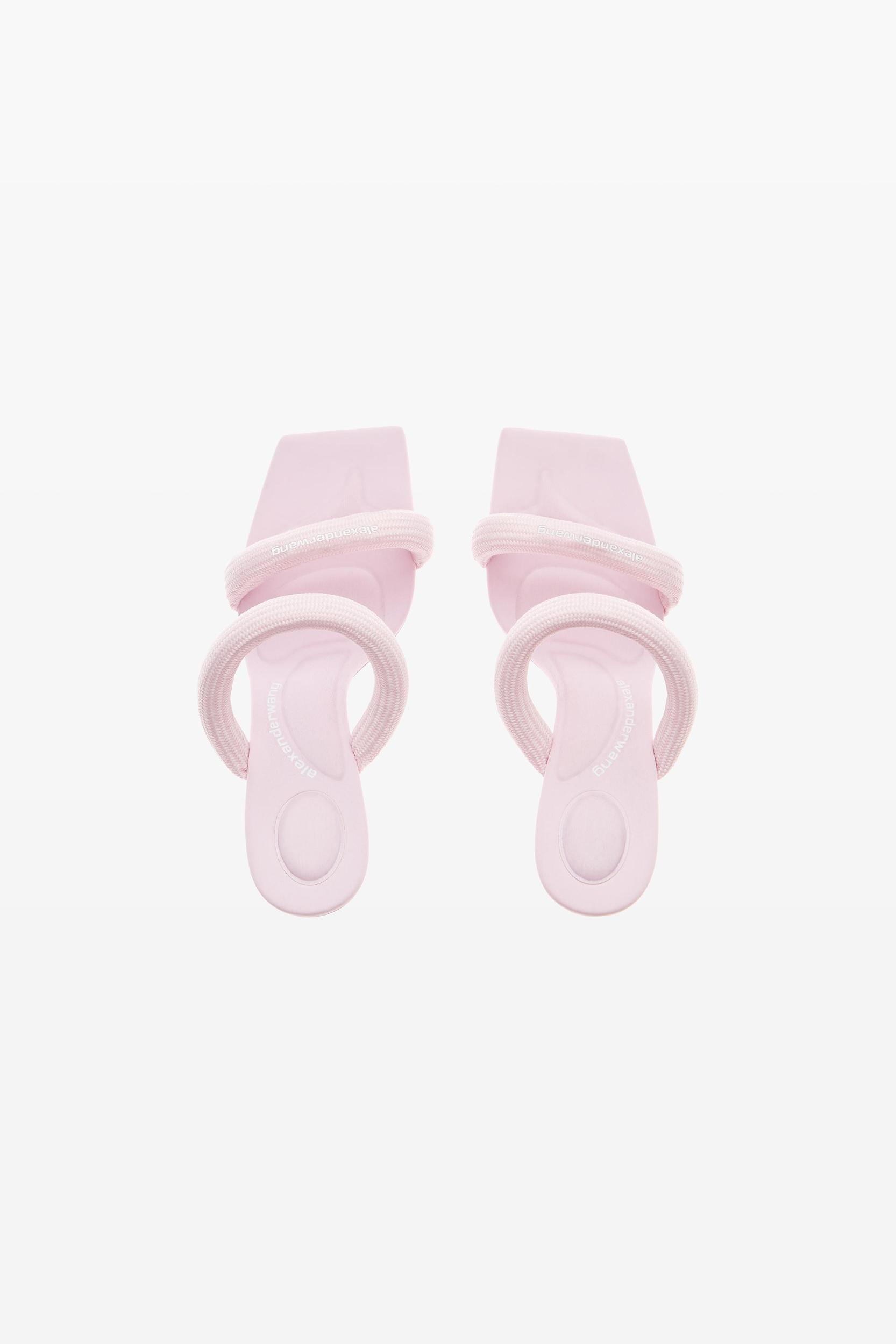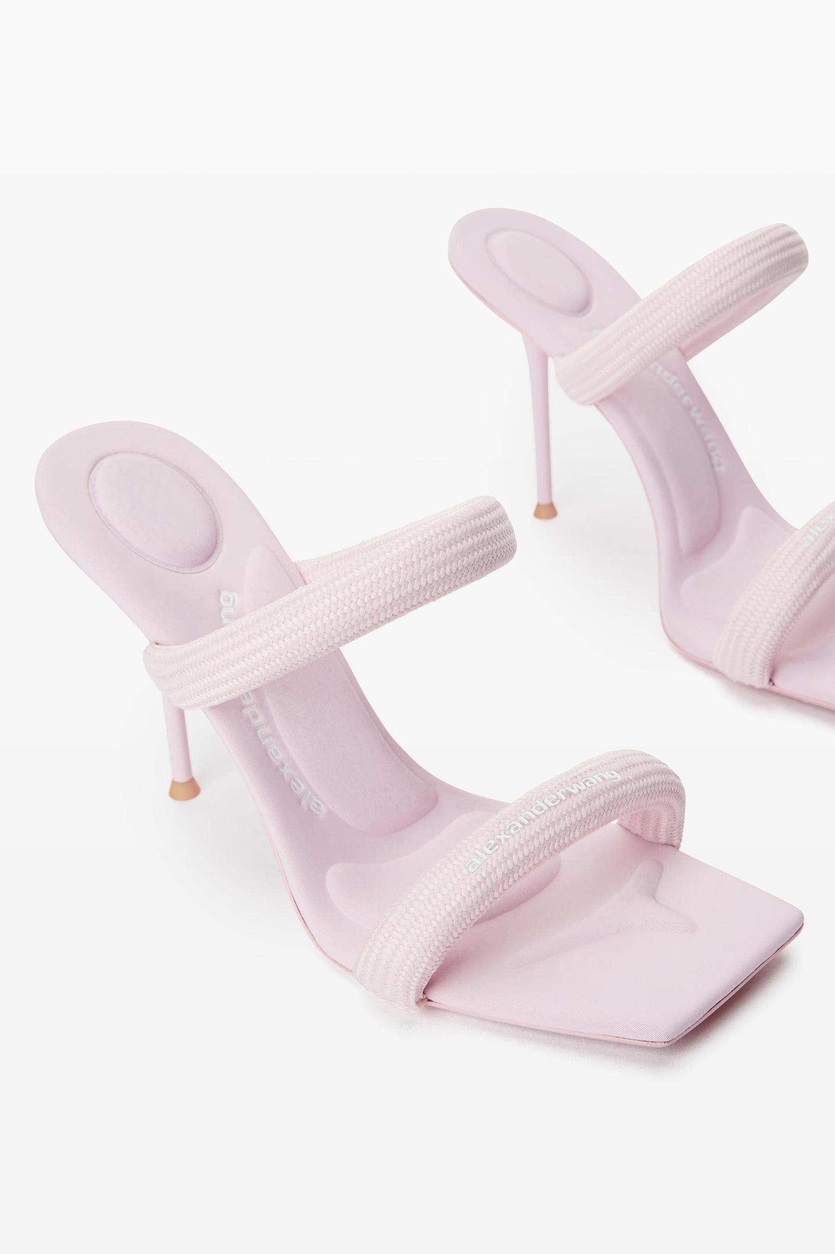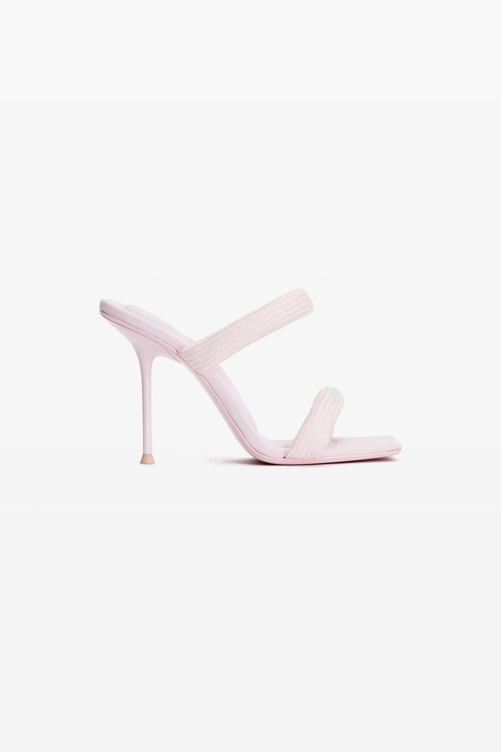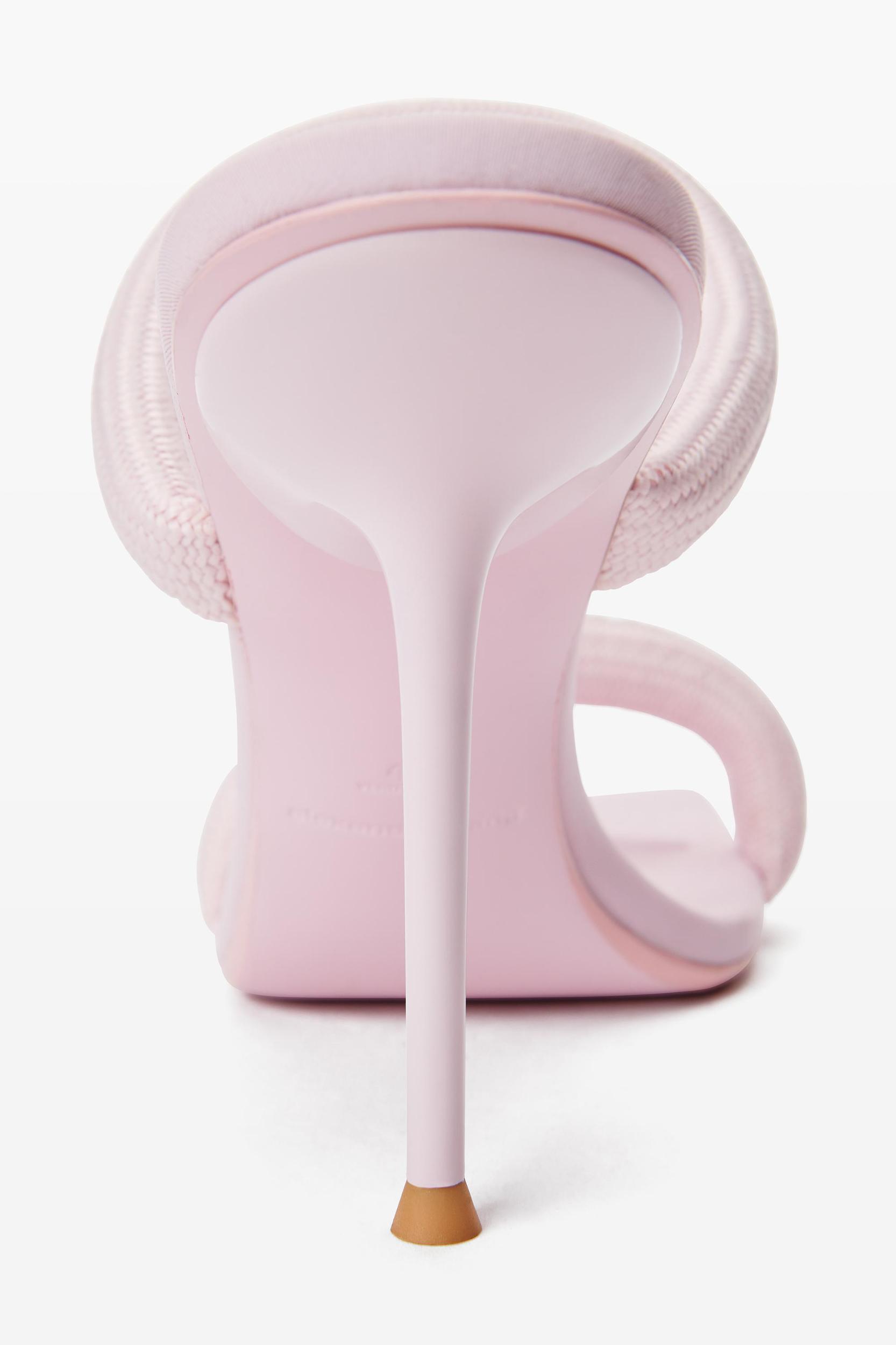 padded light pink stiletto sandal with a woven logo detail.