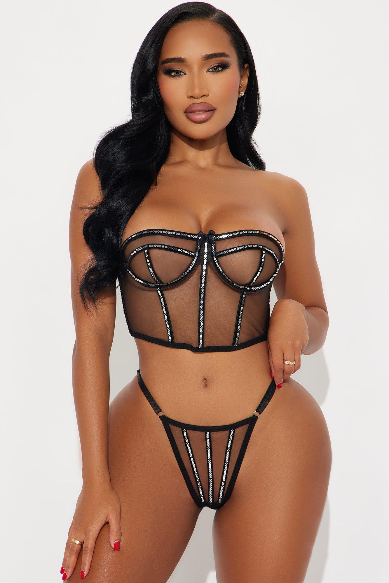 Available In Black. Mesh 2 Piece Ensemble Strapless Corset Top Underwire Sequin Trim Detail Bow Applique Matching Thong Panty Final Sale 100% Nylon Imported California Proposition 65WARNING: Cancer and Reproductive Harm - www.P65Warnings.ca.gov.