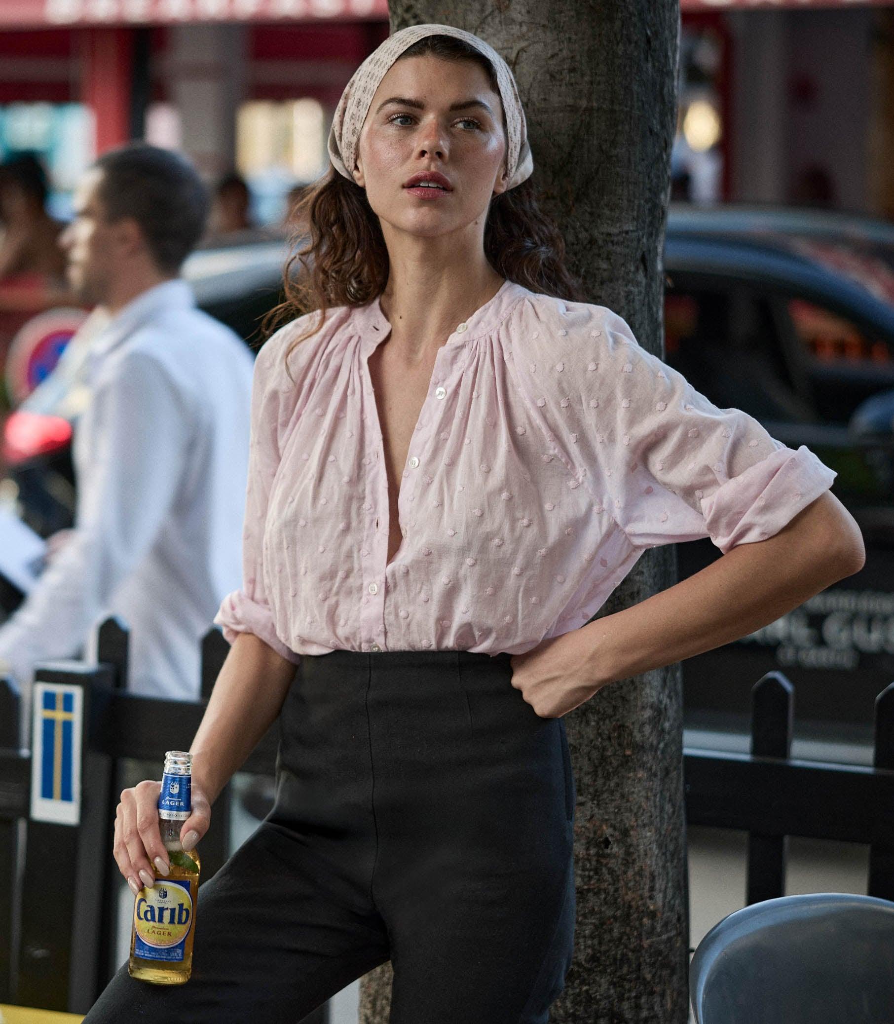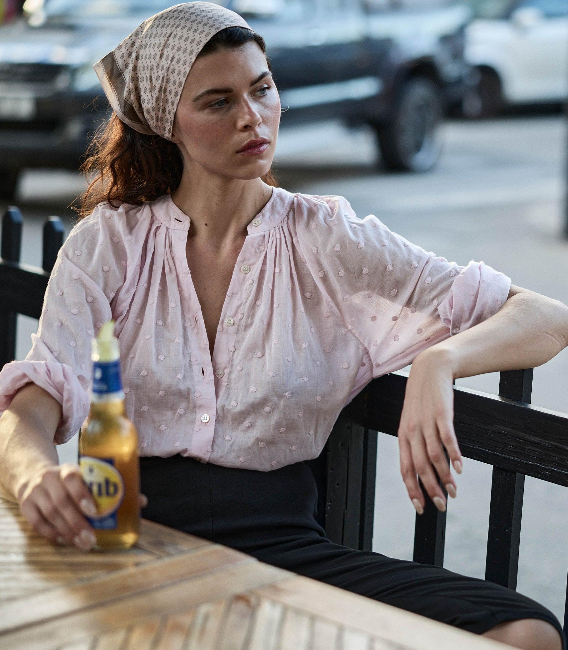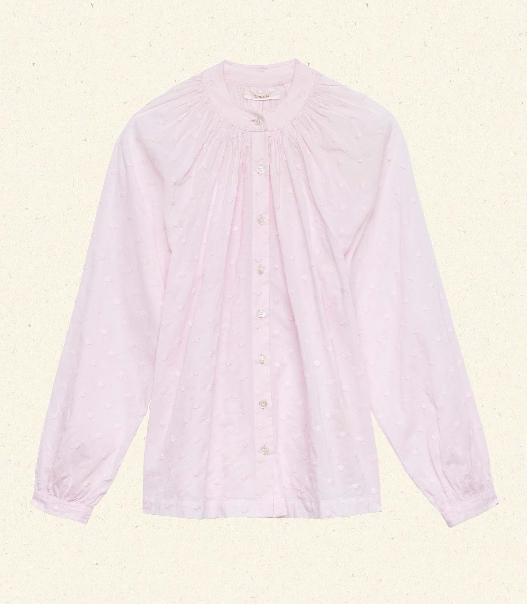 In a soft, organic cotton with embroidered Swiss dots, the Julienne Top—which takes cues from our beloved Jane Blouse—features a breezy silhouette, full-length raglan sleeves and a wide stand collar. A line of mother-of-pearl buttons extends down the center front. Wear it loose, or tuck it into your favorite high-waisted jeans.