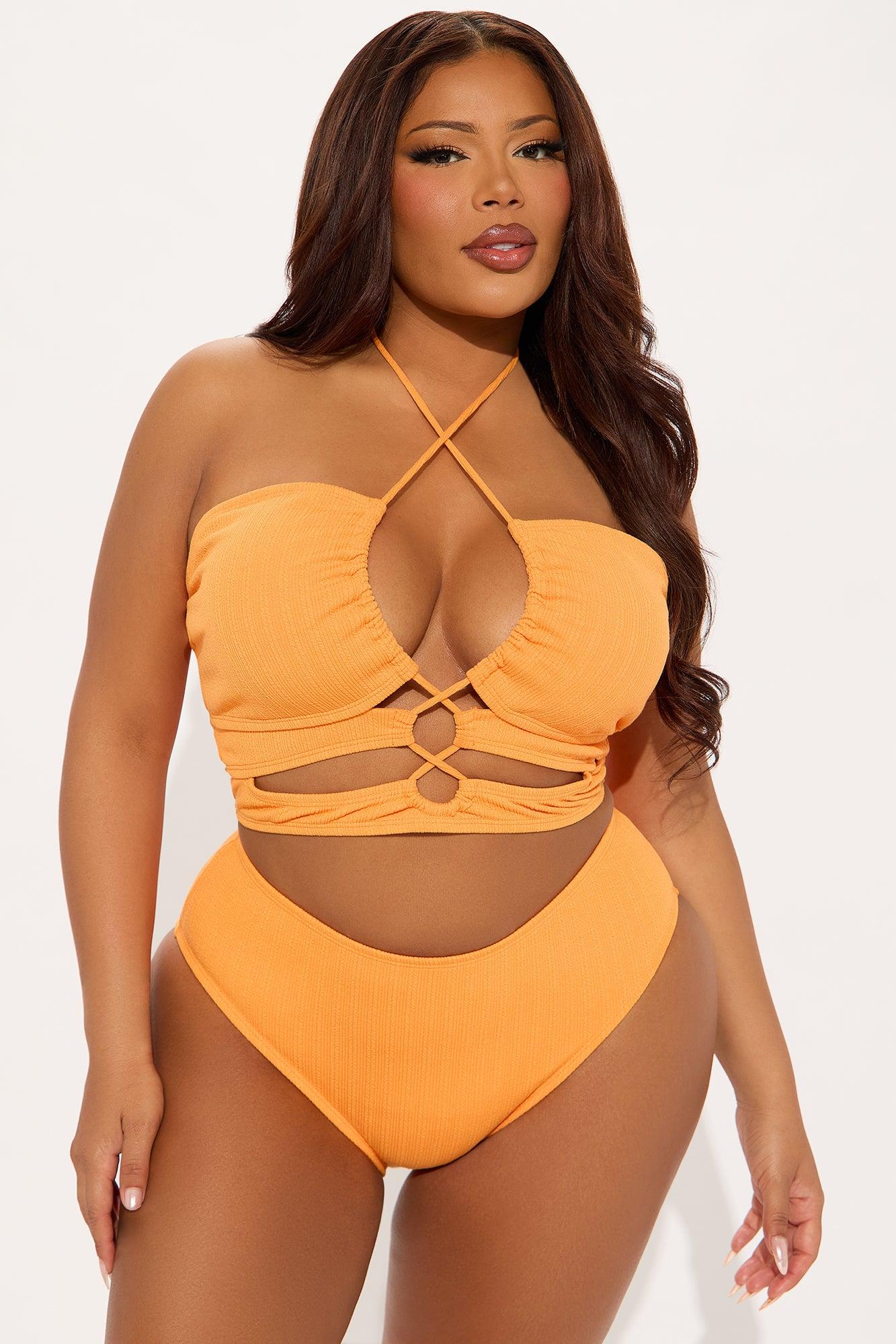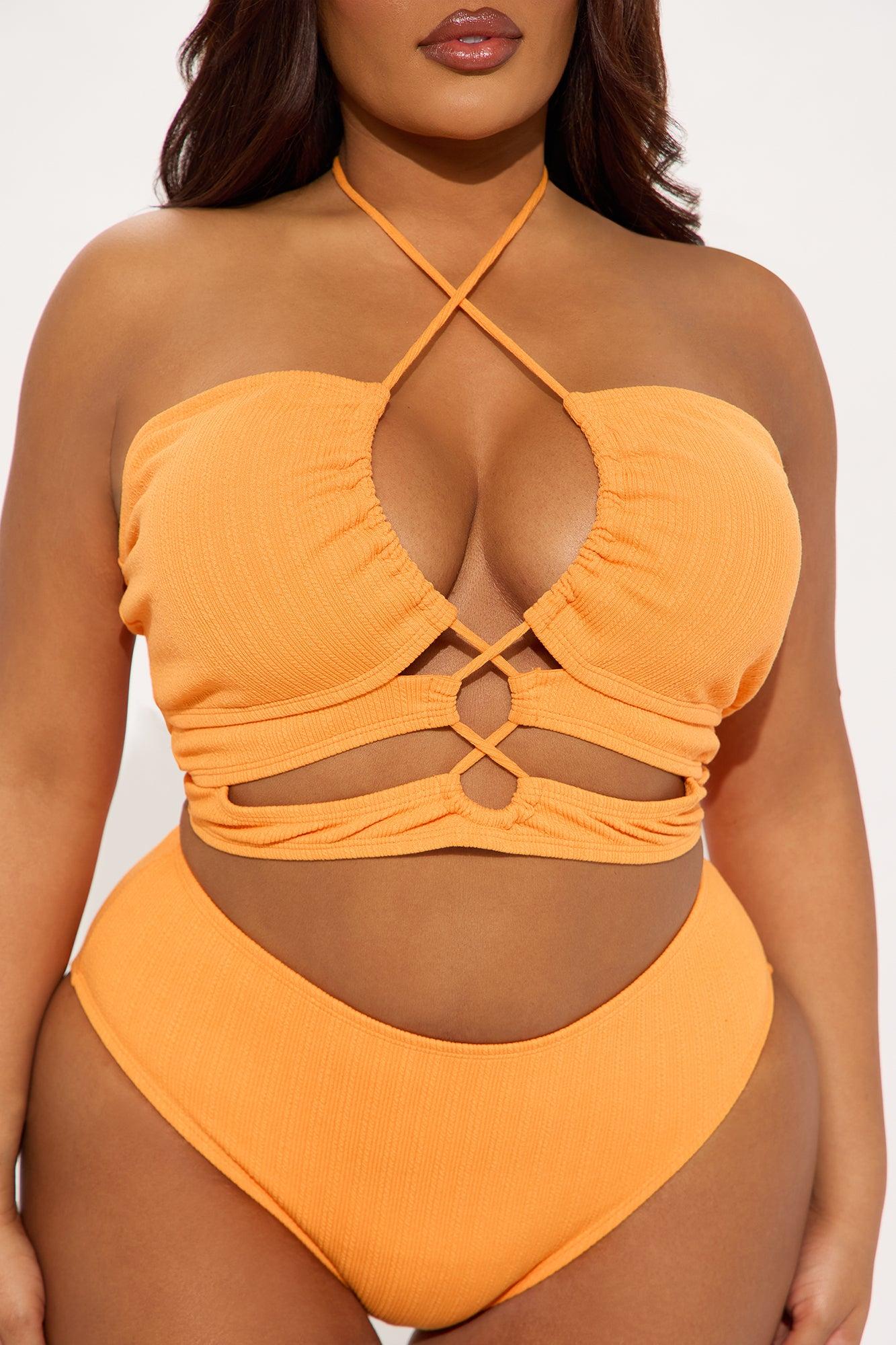 Available In Orange. 2 Piece Bikini Textured Tankini Bikini Top Removable Cups Halter Neck Ties Cut Out Ruching Detail Bikini Bottom, Cheeky Adjustable Side Tie Full Stretch Final Sale Shell: 93% Polyester 7% Spandex Lining: 95% Polyester 5% Spandex Imported