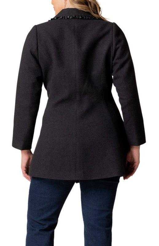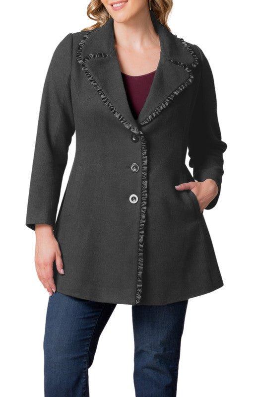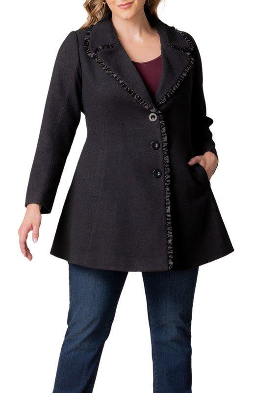 Keep warm in style with the plus size Juliette Coat. This 3 button, single breasted flared coat features a wide ulster lapel, long sleeves, and welt pockets. Princess seams give shape to this beautiful coat accented with feminine ruffled satin trim.