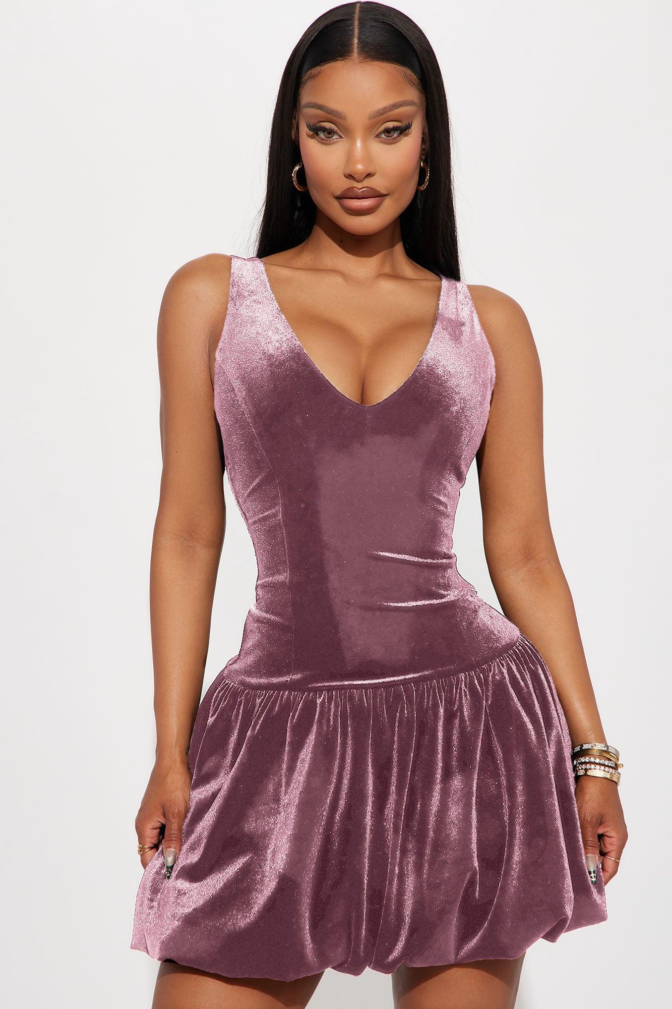Available In Mauve And Black. Velvet Bubble Mini Dress V-neck Sleeveless Bubble hem Stretch Length = 33" Self: 90% Polyester 10% Spandex Contrast/Lining: 100% Polyester Imported