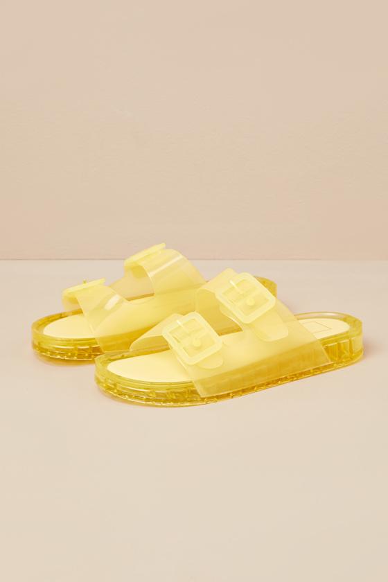 For the girls who have a lot to do this summer, these trendy slide-on sandals by Dolce Vita make summer styling quick, comfortable, and cute. Jelly-like vinyl shapes a rounded footbed and wide adjustable straps with matching buckles, all atop a chunky sole that completes the look. Available in whole sizes only.