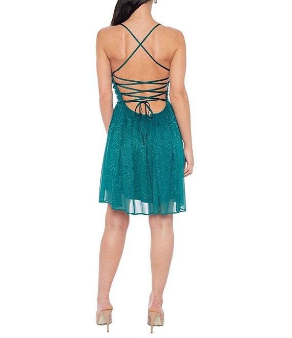 Jump Sleeveless Glitter Matte Jersey Lace Up Back Mini Dress