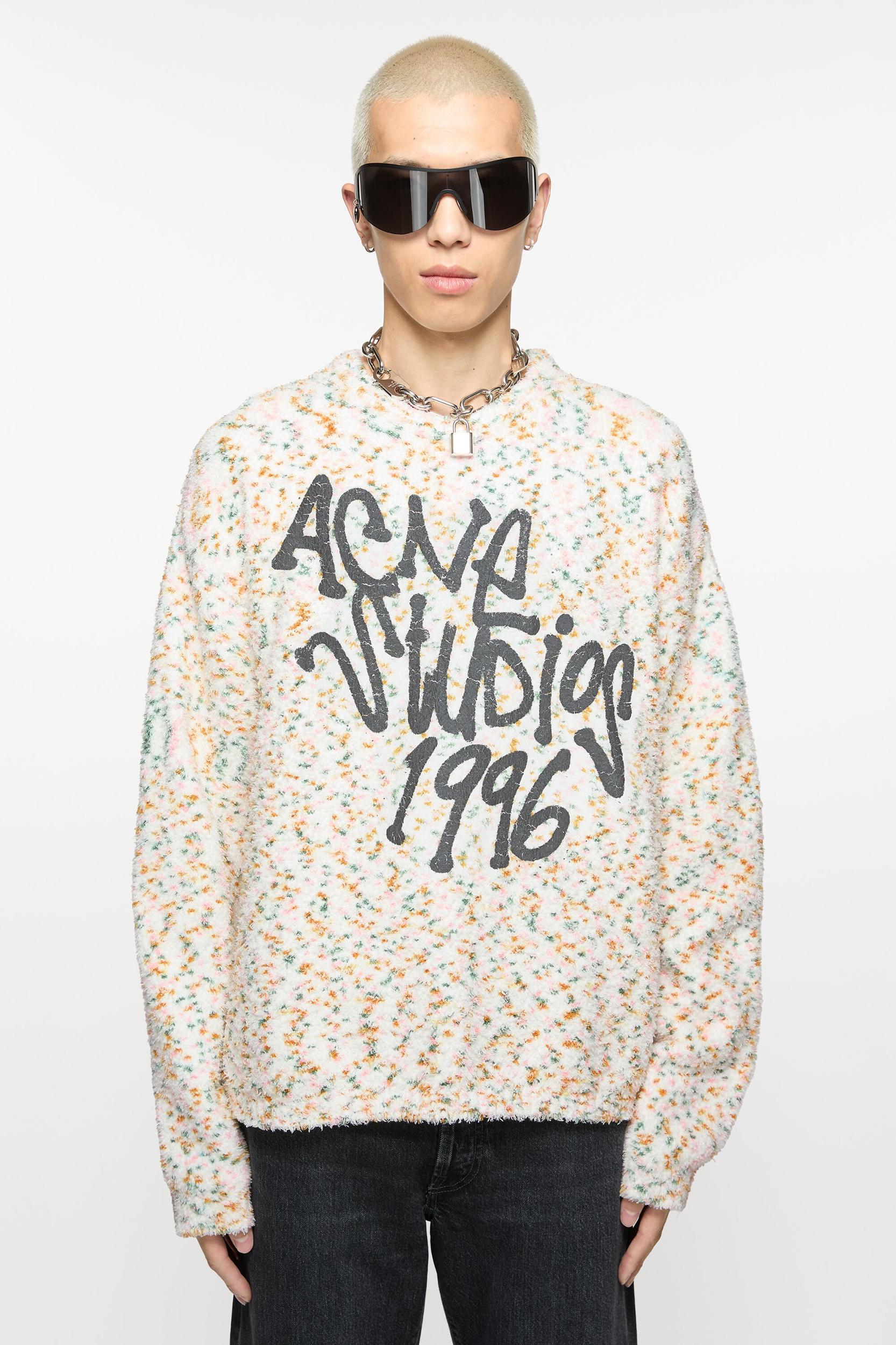 Crew neck jumper features a multi-coloured confetti dyed animation and a seasonal Acne Studios logo print with a metallic finish. Cut to relaxed finish. FN-MN-KNIT000527