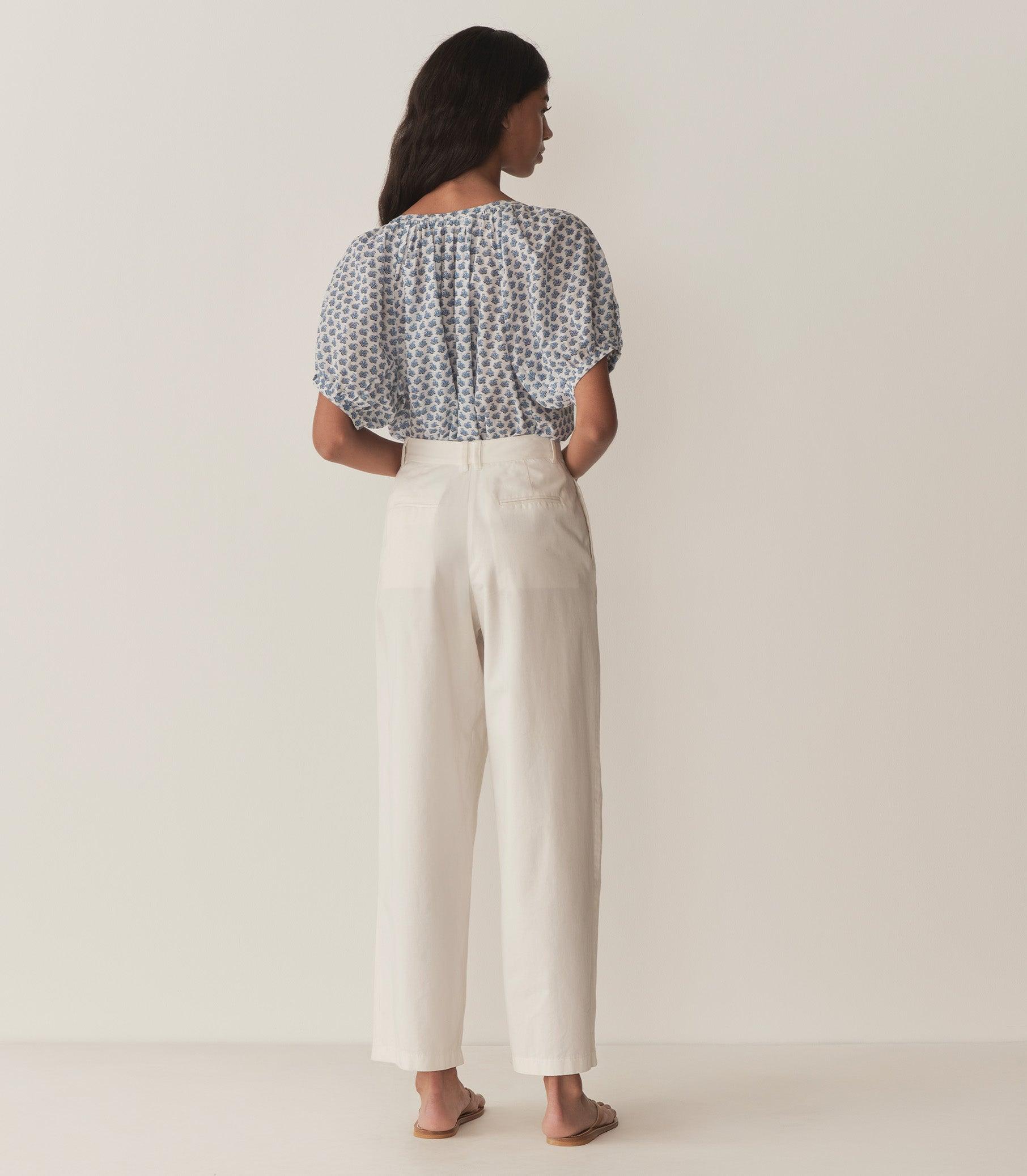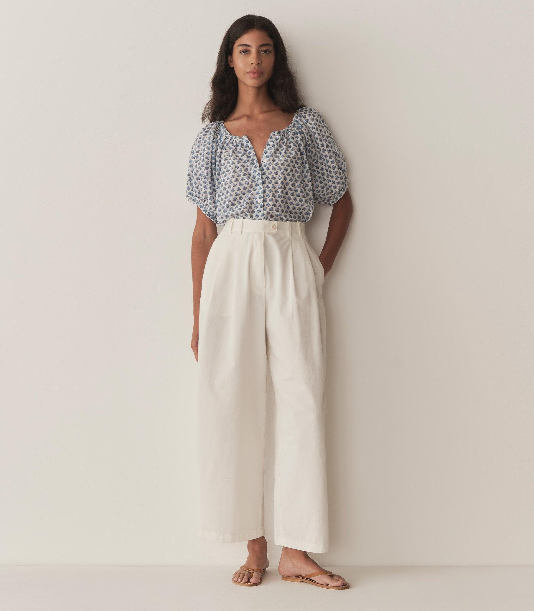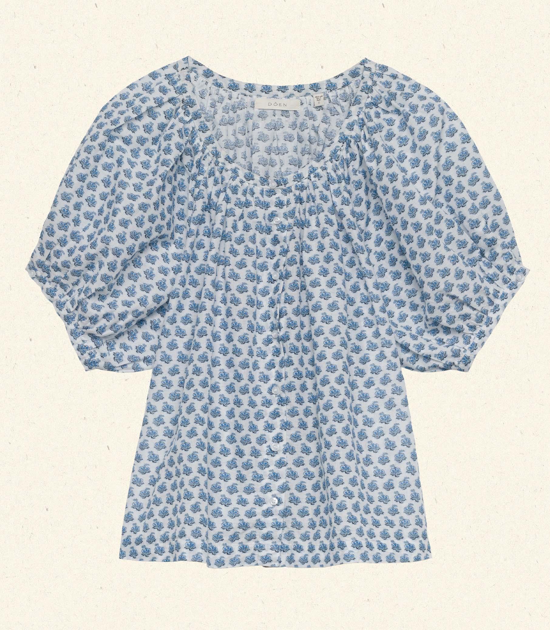 In a midweight organic cotton voile and rendered in our ‘60s-inspired Dahlia Ditsy, the June Top is a short-sleeved take on our beloved Jane Blouse. It features a gathered scoop neckline, full raglan sleeves, and a relaxed, breezy cut. A line of mother-of-pearl buttons extends down the center front. Wear it loose, or tuck it into your favorite high-waisted jeans or shorts.